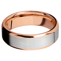 7 mm wide/Beveled/14K Rose Gold band with one 5 mm Centered inlay of 14K White Gold.