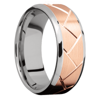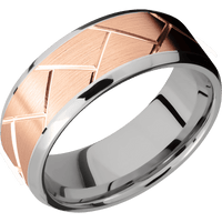 8 mm wide/Beveled/14K White Gold band with one 6 mm Centered inlay of 14K Rose Gold with a machined Flatweave pattern.