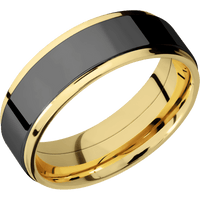7 mm wide/Flat Grooved Edges/14K Yellow Gold band with one 5 mm Raised Centered inlay of Zirconium.