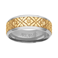 "7.5MM 1850 Collection Comfort Fit Band with Carved Polished Geometric Floral Inlay and Sandblast Details with Polished Flat Bevel Edge Profile