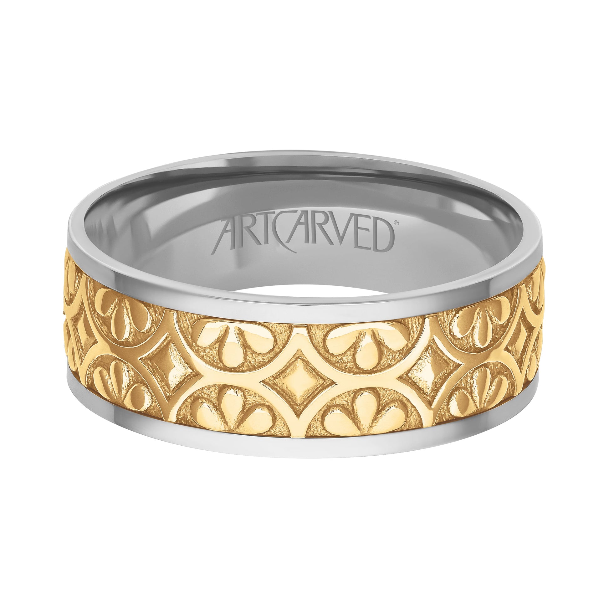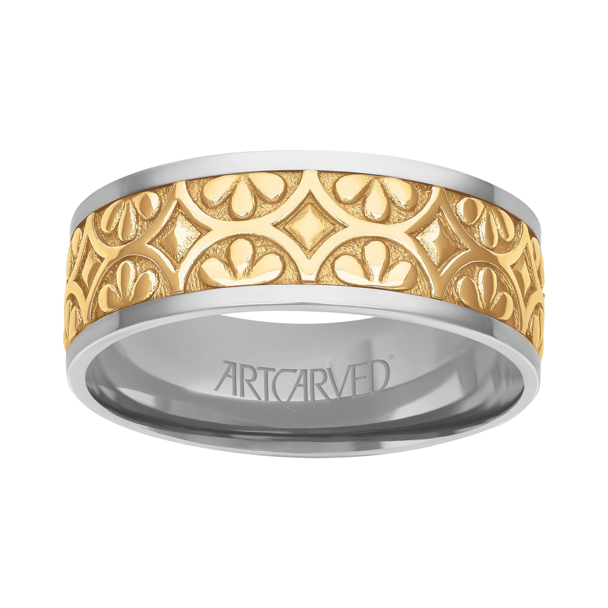 "7.5MM 1850 Collection Comfort Fit Band with Carved Polished Geometric Floral Design Inlay and Sandblast Details and Polished Flat Profile"