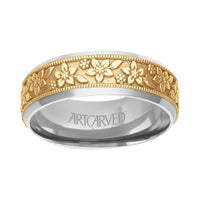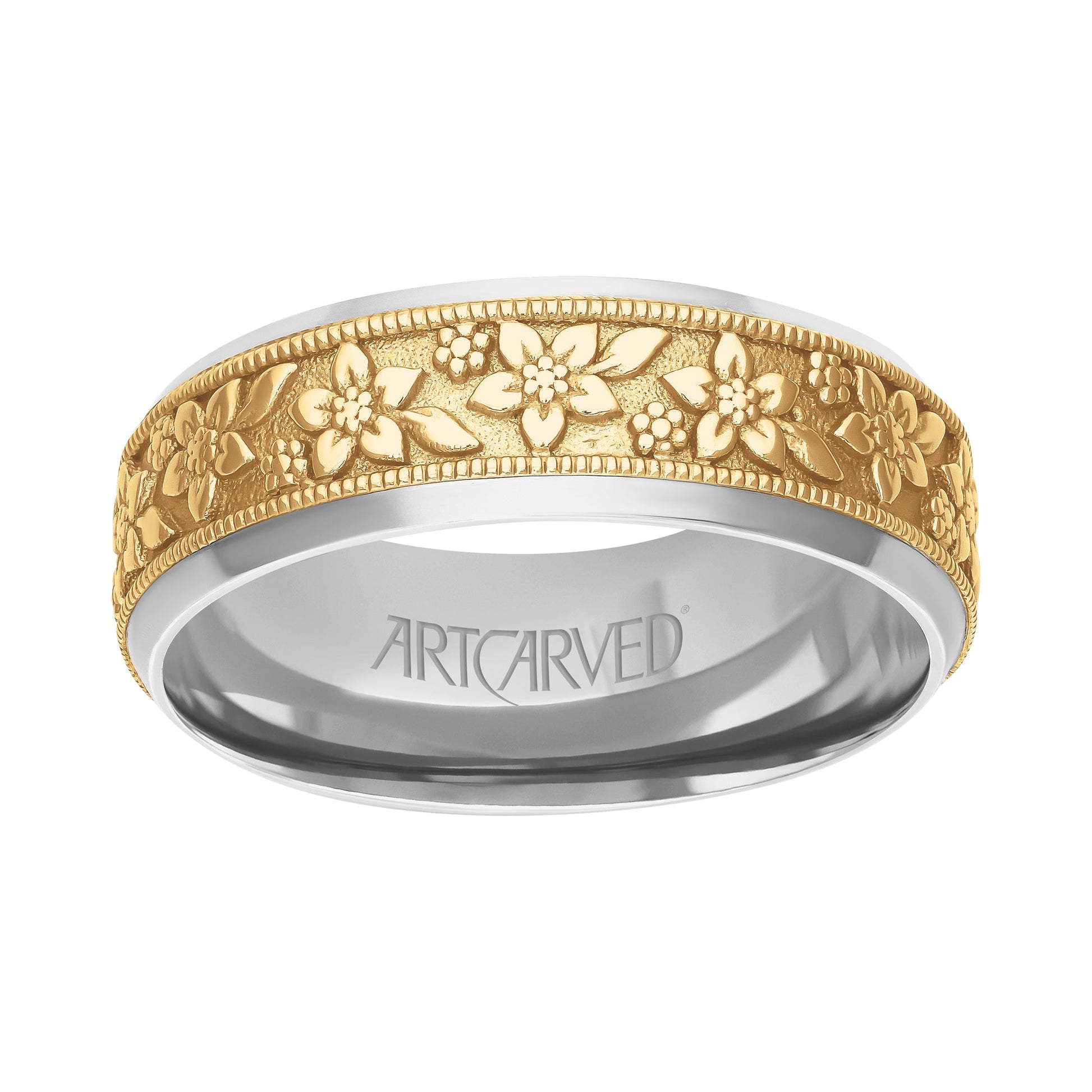 "7MM 1850 Collection Comfort Fit Band with Carved Polished Floral Design Inlay and Sandblast Details and Polished Flat Bevel Edge Profile