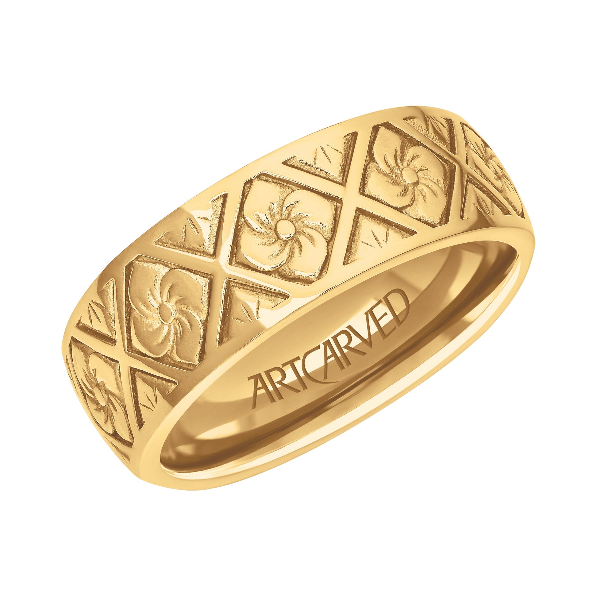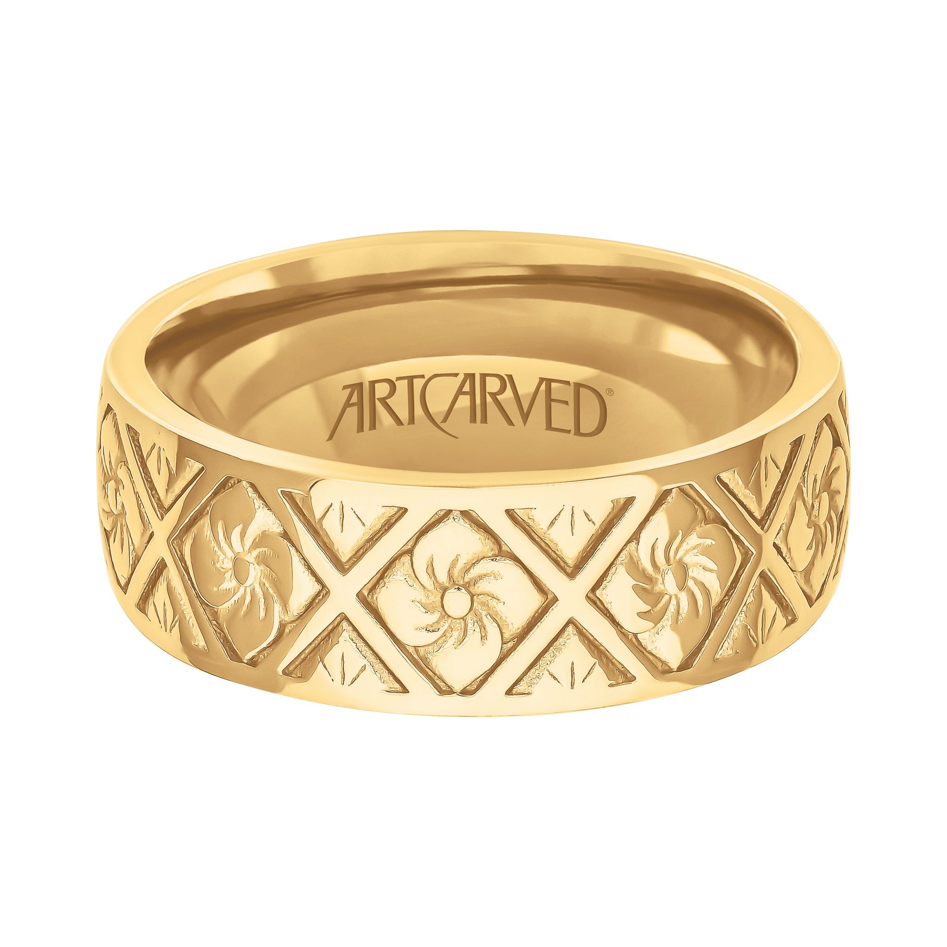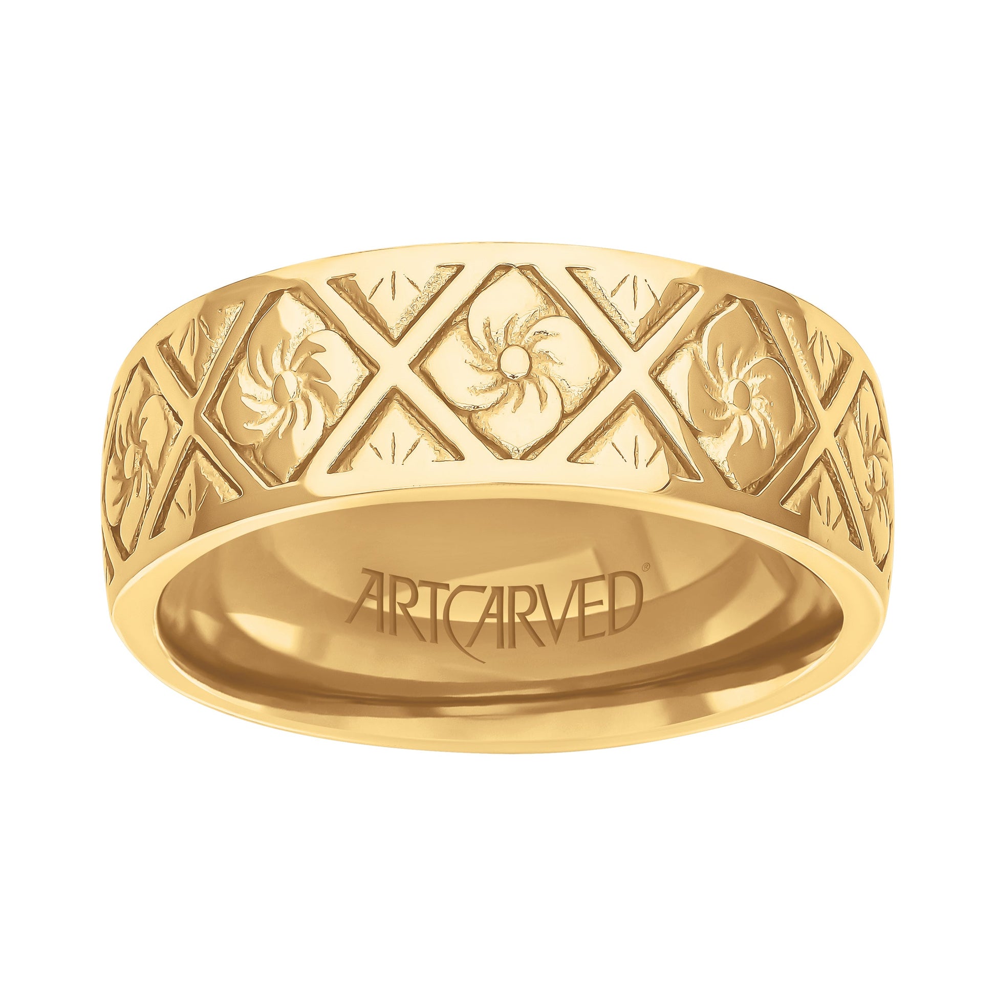 "8MM 1850 Collection Comfort Fit Band with Carved Polished Geometric Floral Center and Sandblast Details with Polished Low Dome Profile