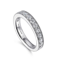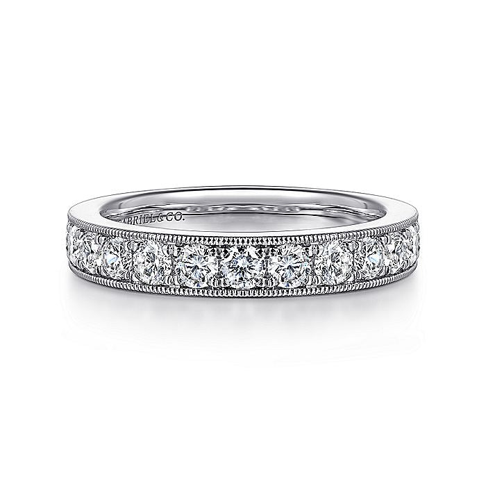 Intricate milgrain detailing adds a vintage touch to this classic white gold and pave diamond anniversary band