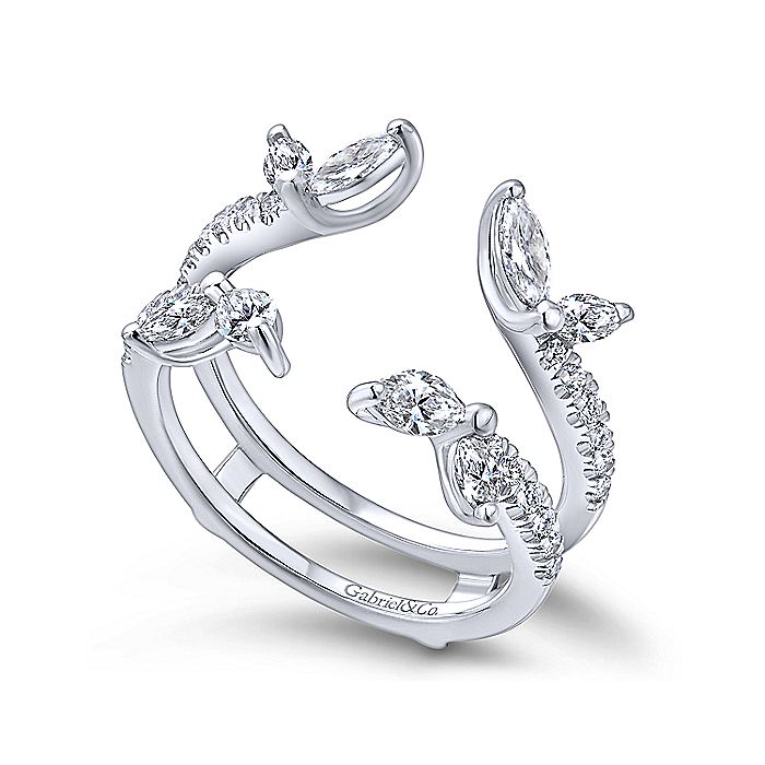 Embrace your engagement ring with this magnificent ring jacket, featuring four branches of French pave diamonds each ending with a pair of prong-set marquise diamond buds.