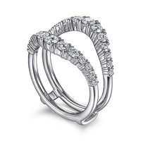 Graduated rows of prong set round diamonds adorn the upper and lower tiers of this lovely 14k white gold enhancer ring. Slip it on around your own cherished ring to add an additional .96cts of diamond sparkle.
