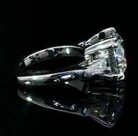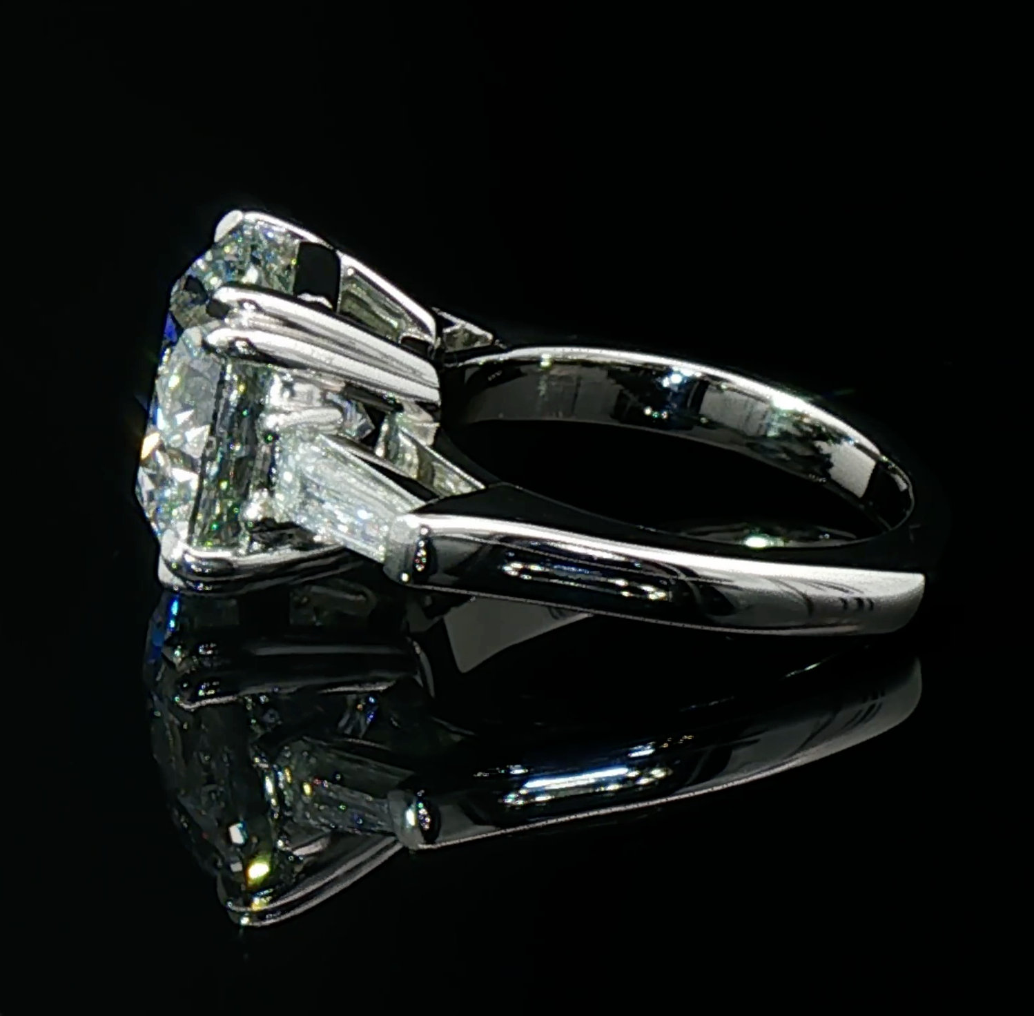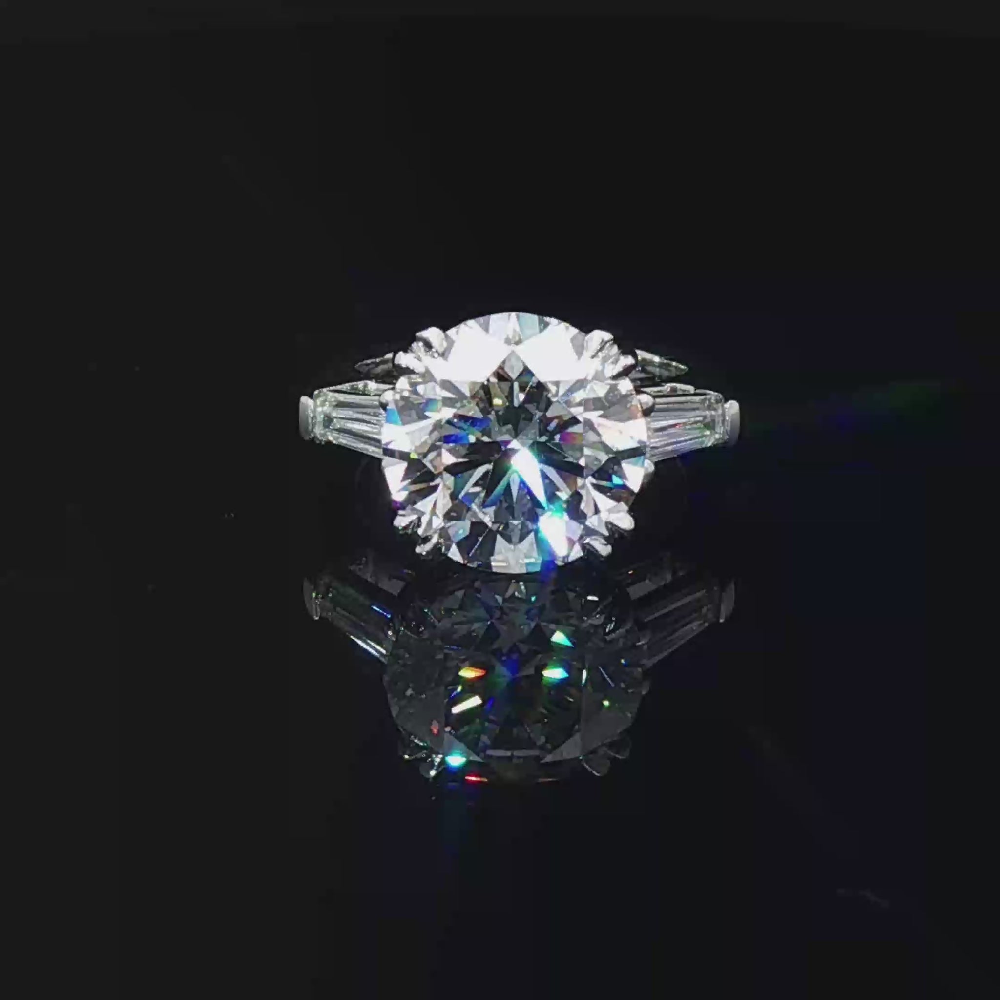 Powerfully stunning engagement ring featuring a natural 7.40 carat GIA F/VS1 Hearts & Arrows Ideal Cut round diamond. The flawless setting showcases the diamond's exceptional fire and brilliance, complemented by the cool sheen of white gold accents. A timeless design for a lifetime of elegance.