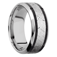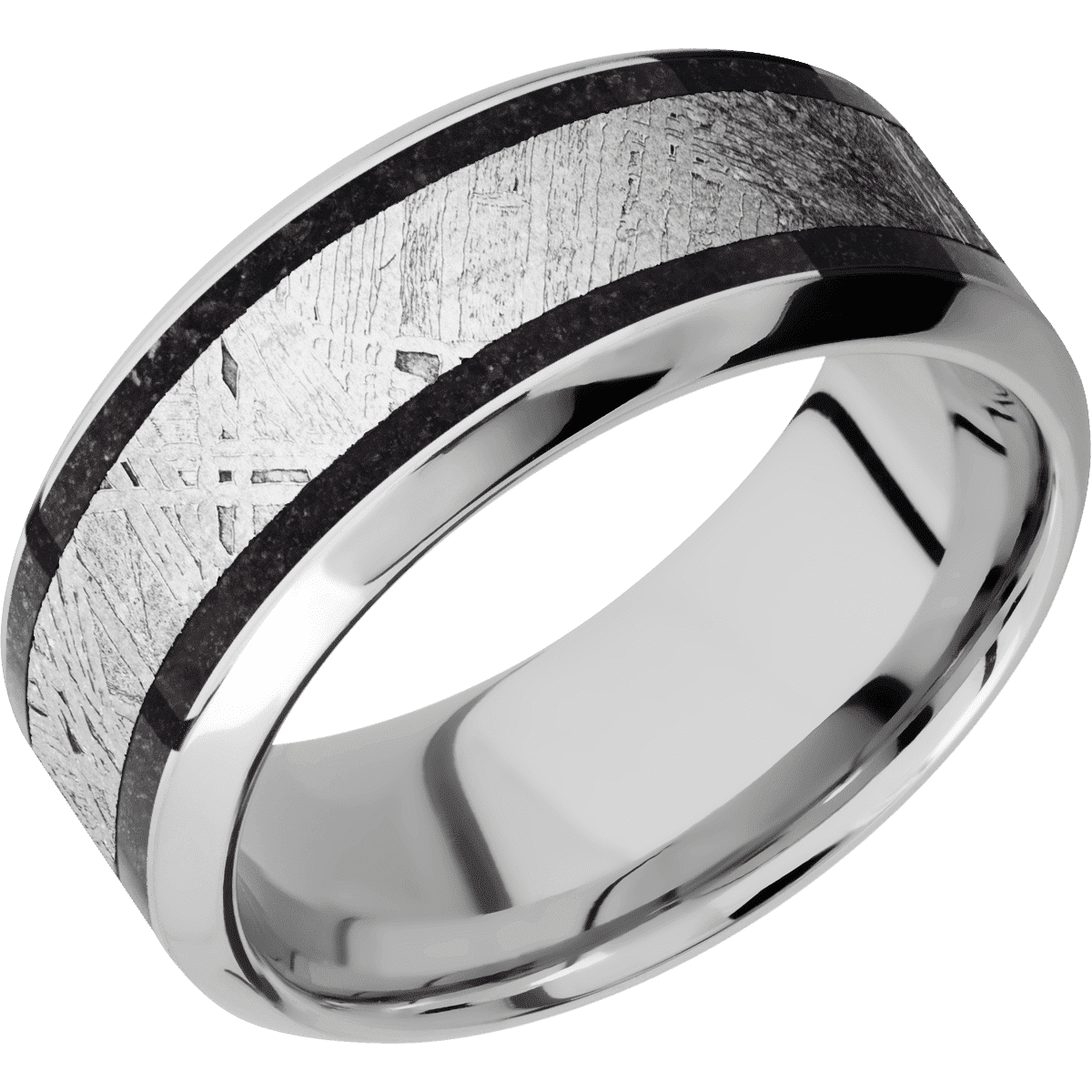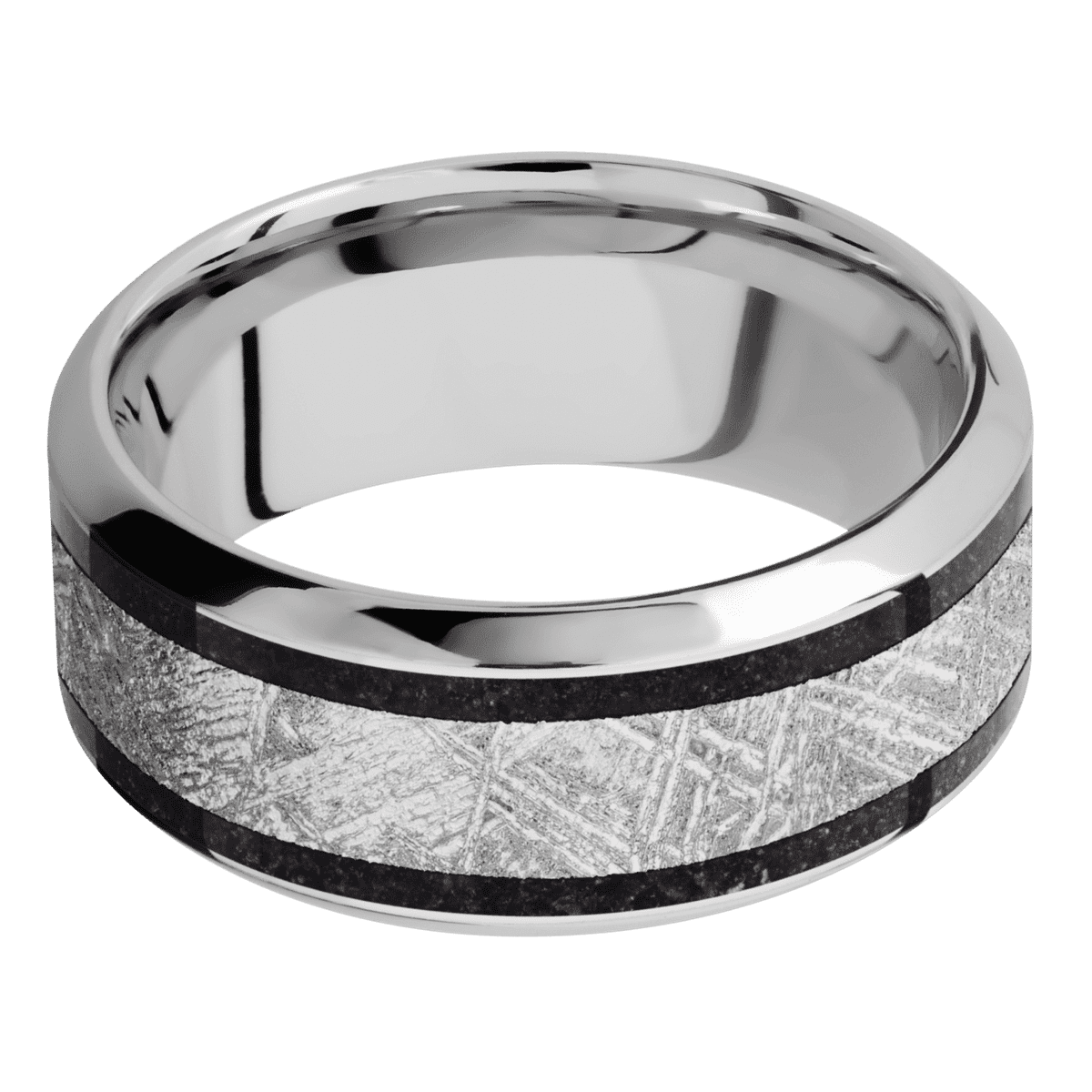 9 mm wide/High Bevel/Cobalt Chrome band featuring inlays of Dinosaur Bone Black and Meteorite.