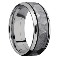 8 mm wide/Beveled/Cobalt Chrome band with one 5 mm Centered inlay of Tantalum.