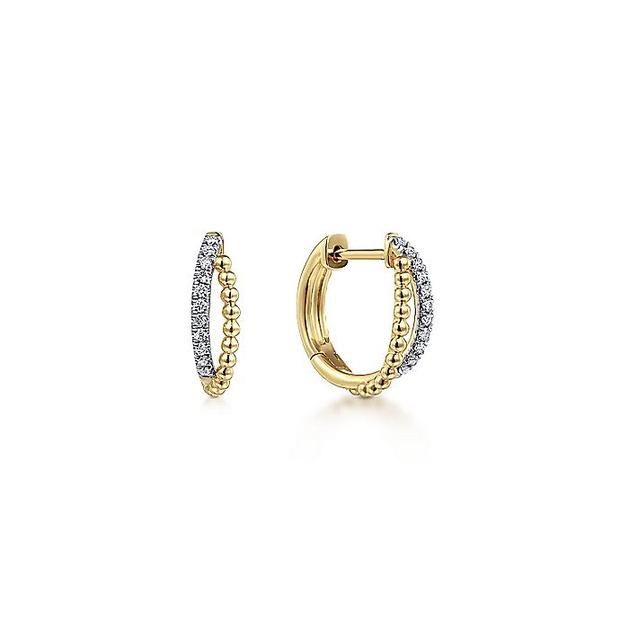 Master day to night style with these chic huggie earrings. Overlapping strands of beaded 14k yellow gold and scintillating 0.10ct pavé diamonds add texture and dimension to each dainty hoop. Your jewelry box needs this low-key yet luxurious pair.