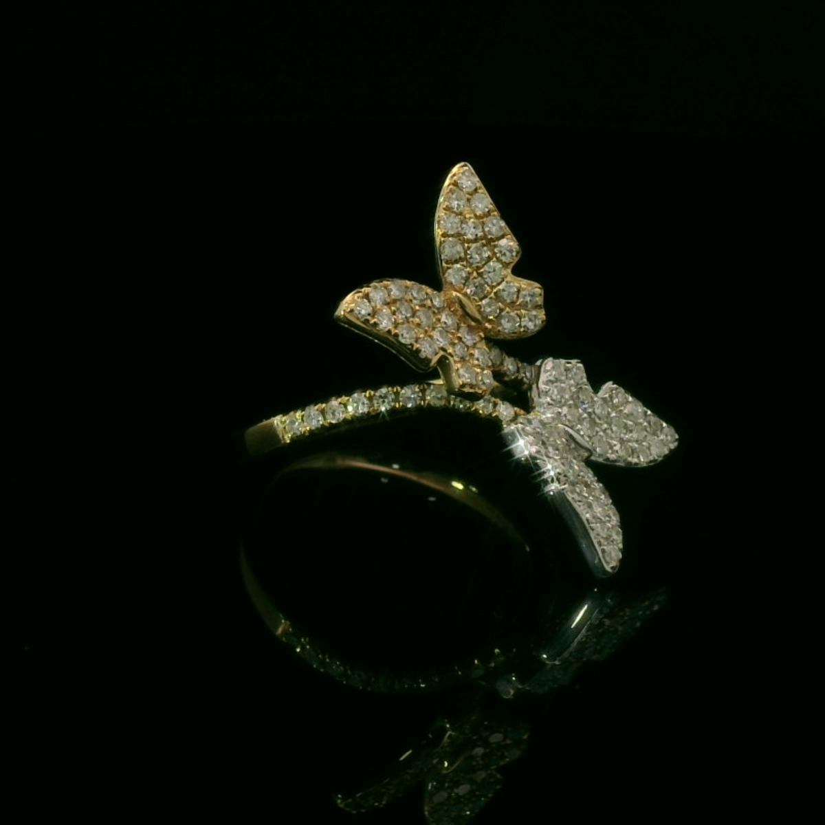 This stunning butterfly ring features intricate designs adorned with sparkling gemstones. The delicate craftsmanship captures the essence of nature, making it a perfect accessory for any occasion. Its unique blend of gold and silver tones adds a touch of elegance to your jewelry collection.