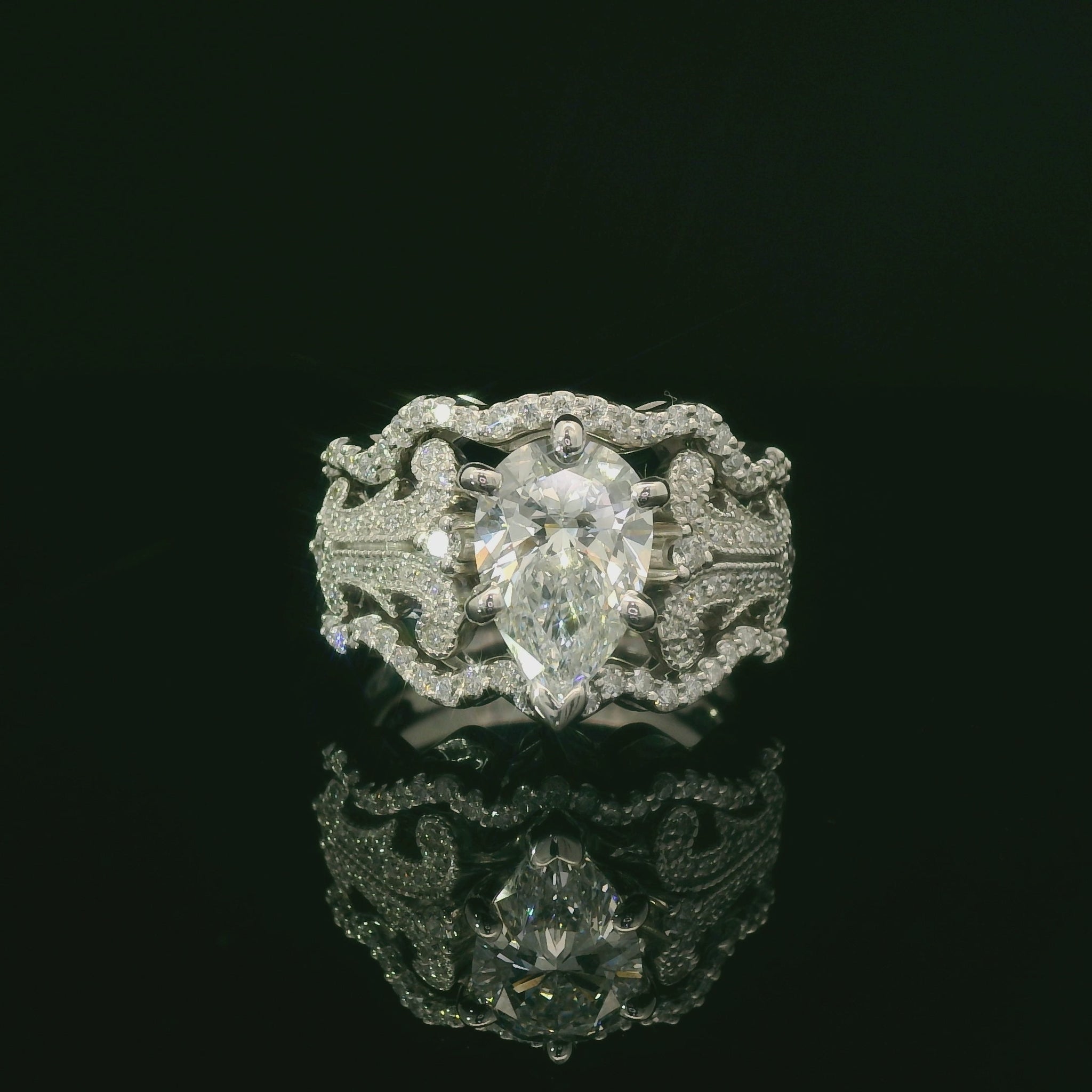 This stunning diamond engagement ring features a unique pear-shaped center stone, surrounded by intricate detailing and smaller diamonds that enhance its brilliance. Crafted with precision, it reflects light beautifully, making it the perfect symbol of love and commitment.