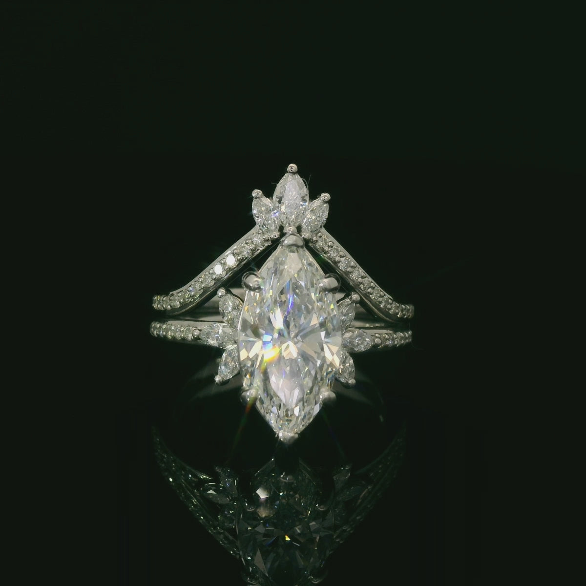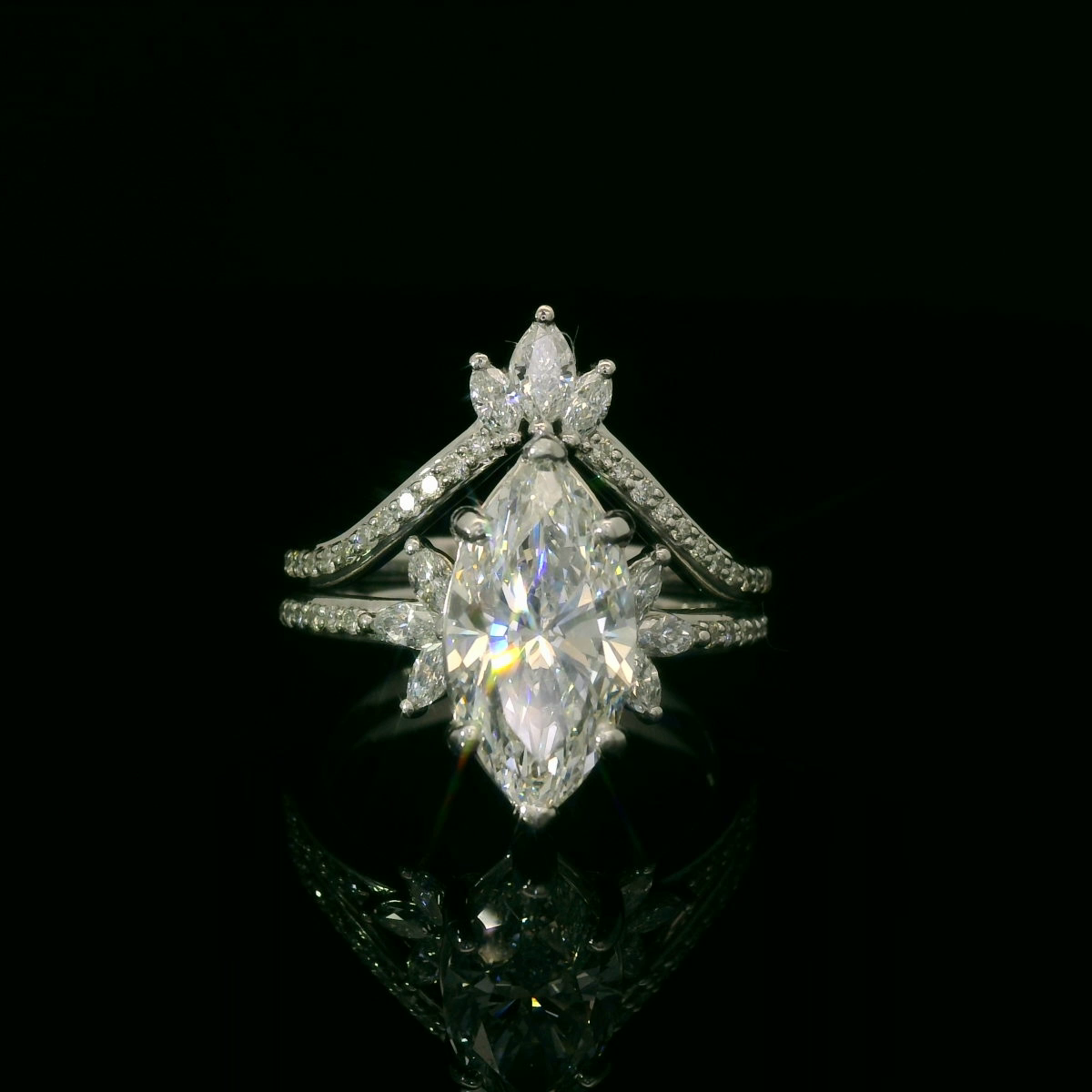 This stunning diamond engagement ring features a brilliant marquise-cut center stone, surrounded by a halo of smaller diamonds. The intricate band design adds a touch of elegance, making it the perfect symbol of love and commitment. Ideal for those looking to make a memorable proposal.