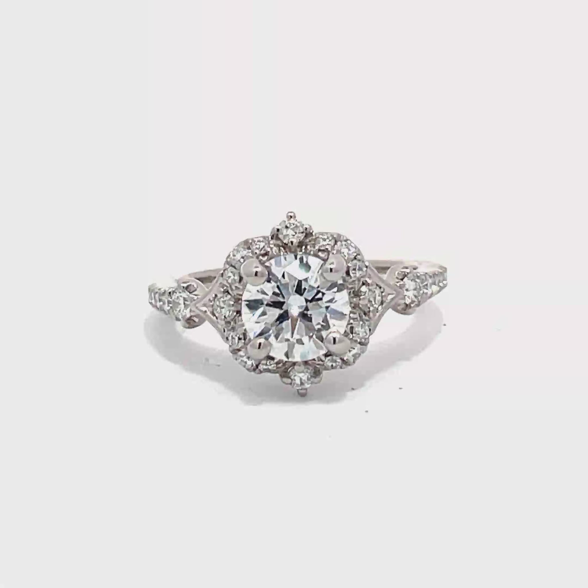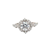 This exquisite engagement ring features a radiant centerpiece with a round-cut diamond that captures the essence of timeless elegance. The band is adorned with smaller, glistening stones that enhance the central gem's brilliance, creating an enchanting sparkle from every angle.