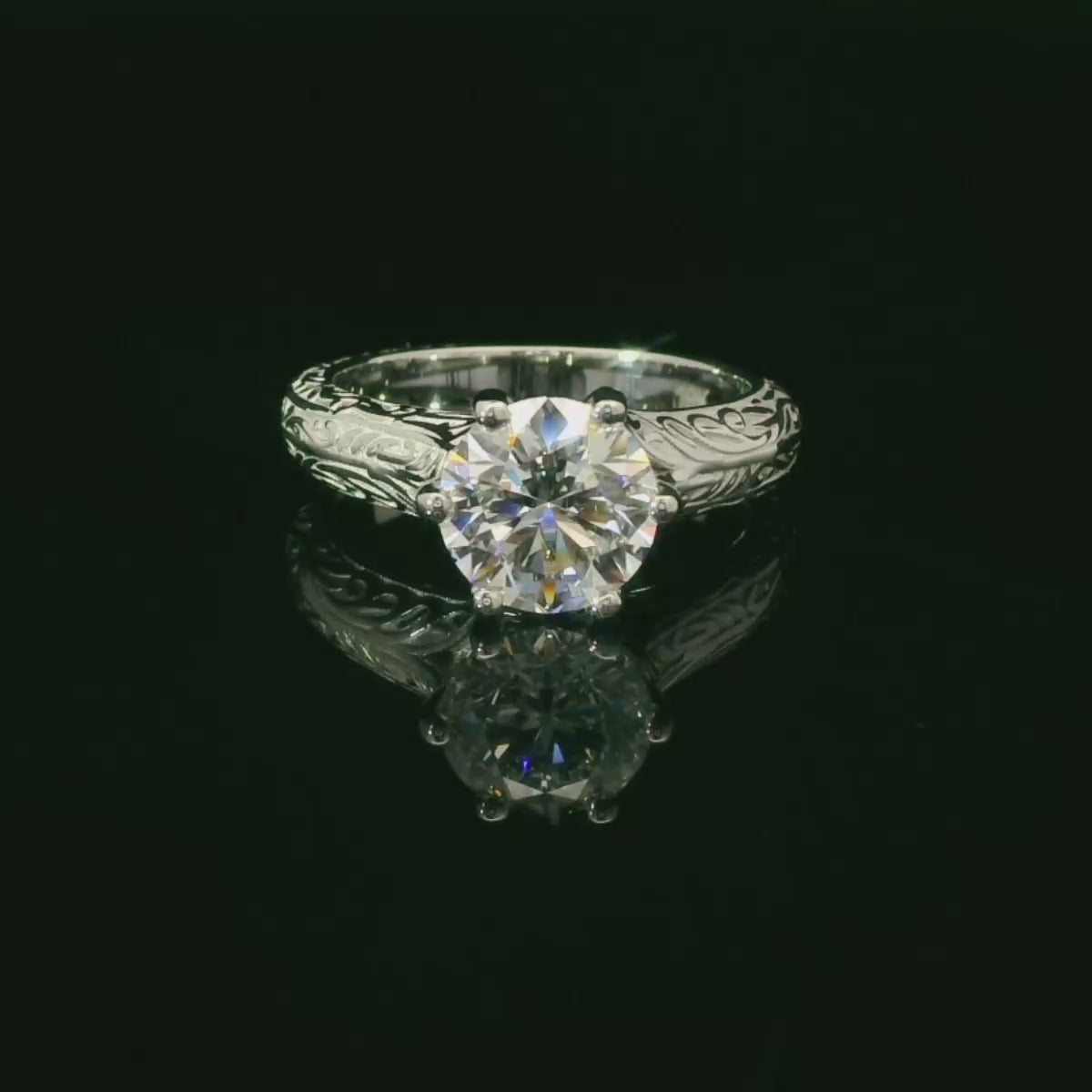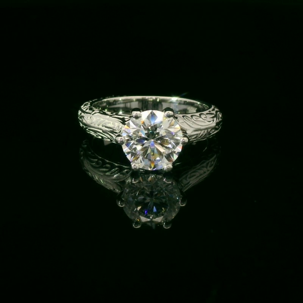 This stunning diamond engagement ring features a brilliant round-cut stone, elegantly set in a beautifully crafted band. The intricate detailing on the band adds a touch of sophistication, making it a perfect symbol of love and commitment.