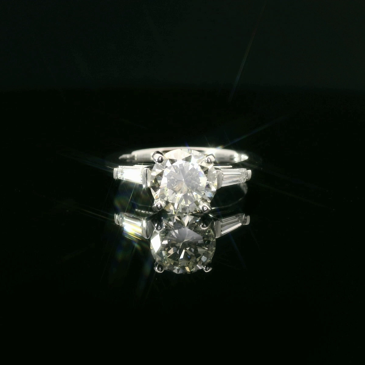This stunning diamond engagement ring features a brilliant round center stone, surrounded by elegant baguette diamonds. Its timeless design and exquisite craftsmanship make it the perfect symbol of love and commitment. Ideal for that special moment, this ring will leave a lasting impression.