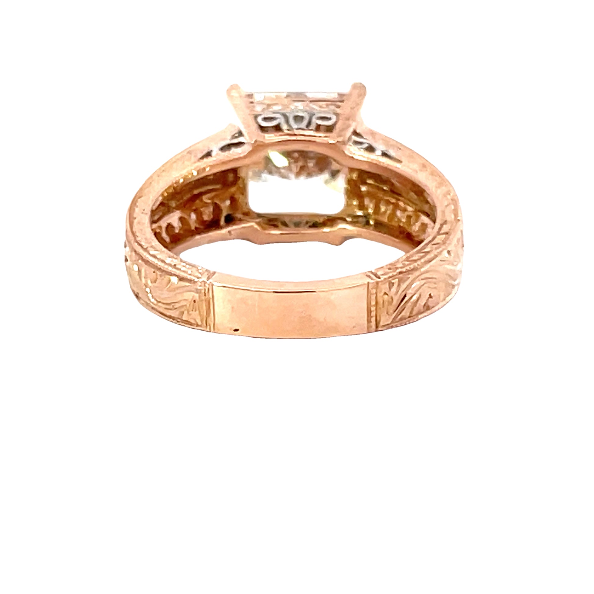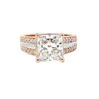 This stunning diamond ring showcases a brilliant square-cut center stone, expertly set in a band adorned with smaller diamonds. The rose gold setting adds a touch of warmth and elegance, making it the perfect statement piece for any occasion.