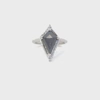 This exquisite ring features a striking diamond-shaped gemstone, elegantly set in a shimmering band. The intricate design and sparkling accents make it the perfect statement piece for any occasion.