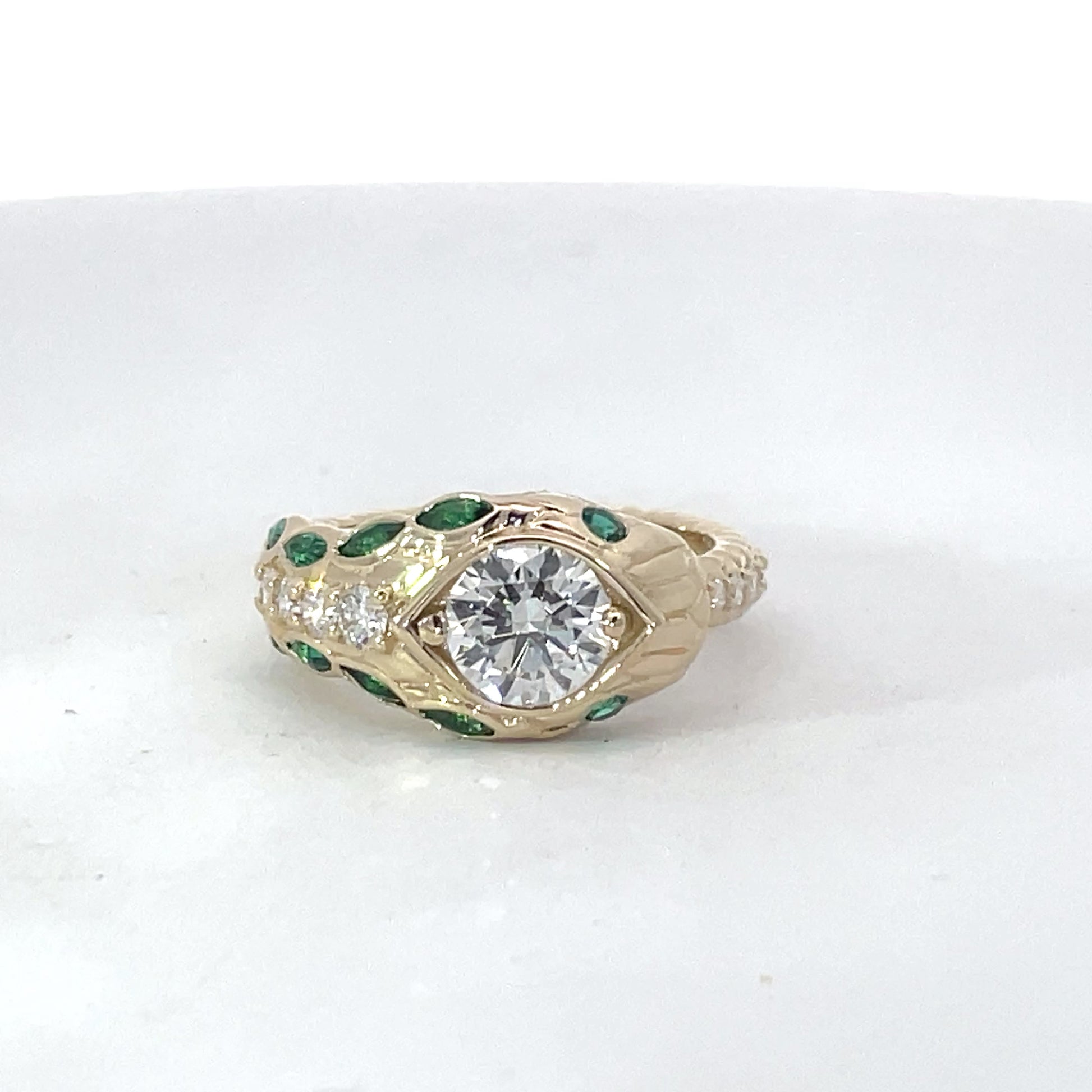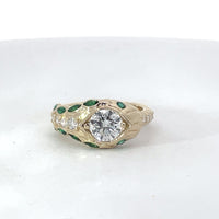 Discover the exquisite beauty of this elegant gold ring, adorned with sparkling diamonds and vibrant green gemstones. Its intricate design captures the essence of luxury, making it the perfect accessory for any occasion. Elevate your jewelry collection with this stunning piece that radiates sophistication and charm.