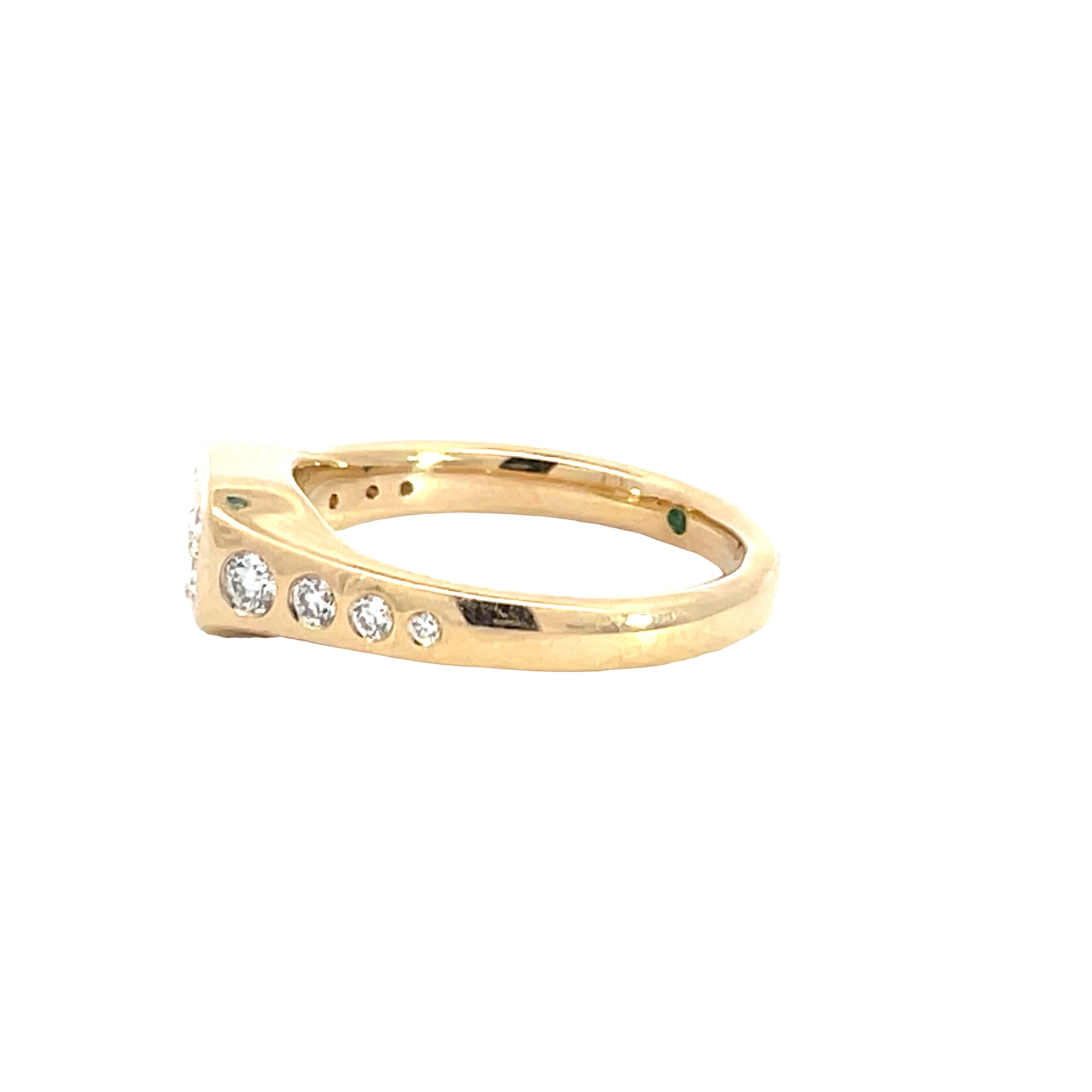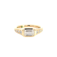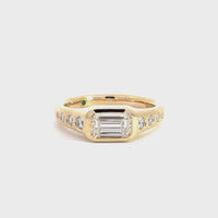 This exquisite gold ring boasts a stunning central emerald-cut diamond, flanked by shimmering round diamonds. Its classic design exudes sophistication, making it the perfect accessory for any occasion that calls for a touch of elegance.