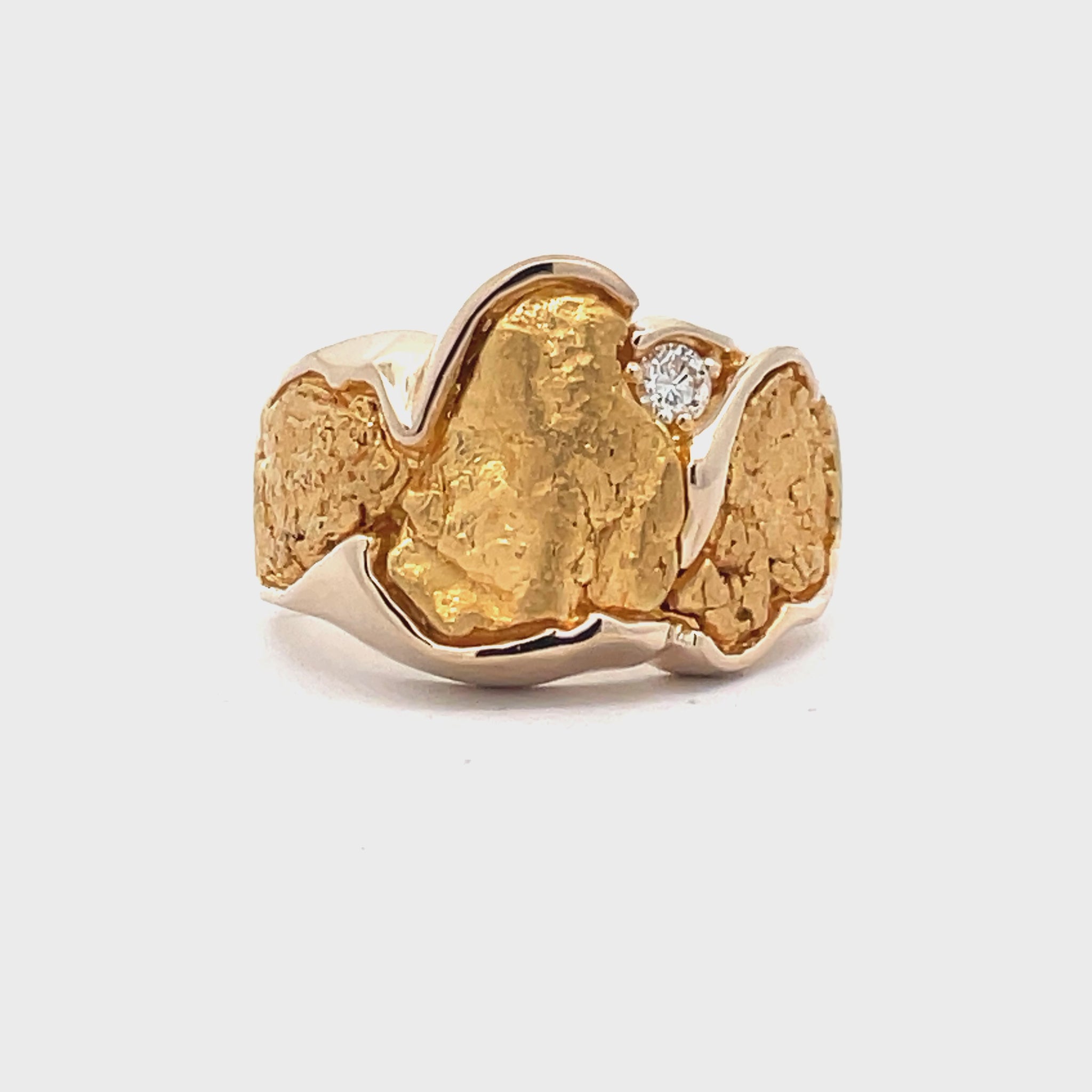 Experience luxury with this exquisite gold nugget ring, featuring a raw, natural texture complemented by a brilliant diamond accent. This piece embodies sophistication and earthy charm, perfect for making a bold statement. .15ct
