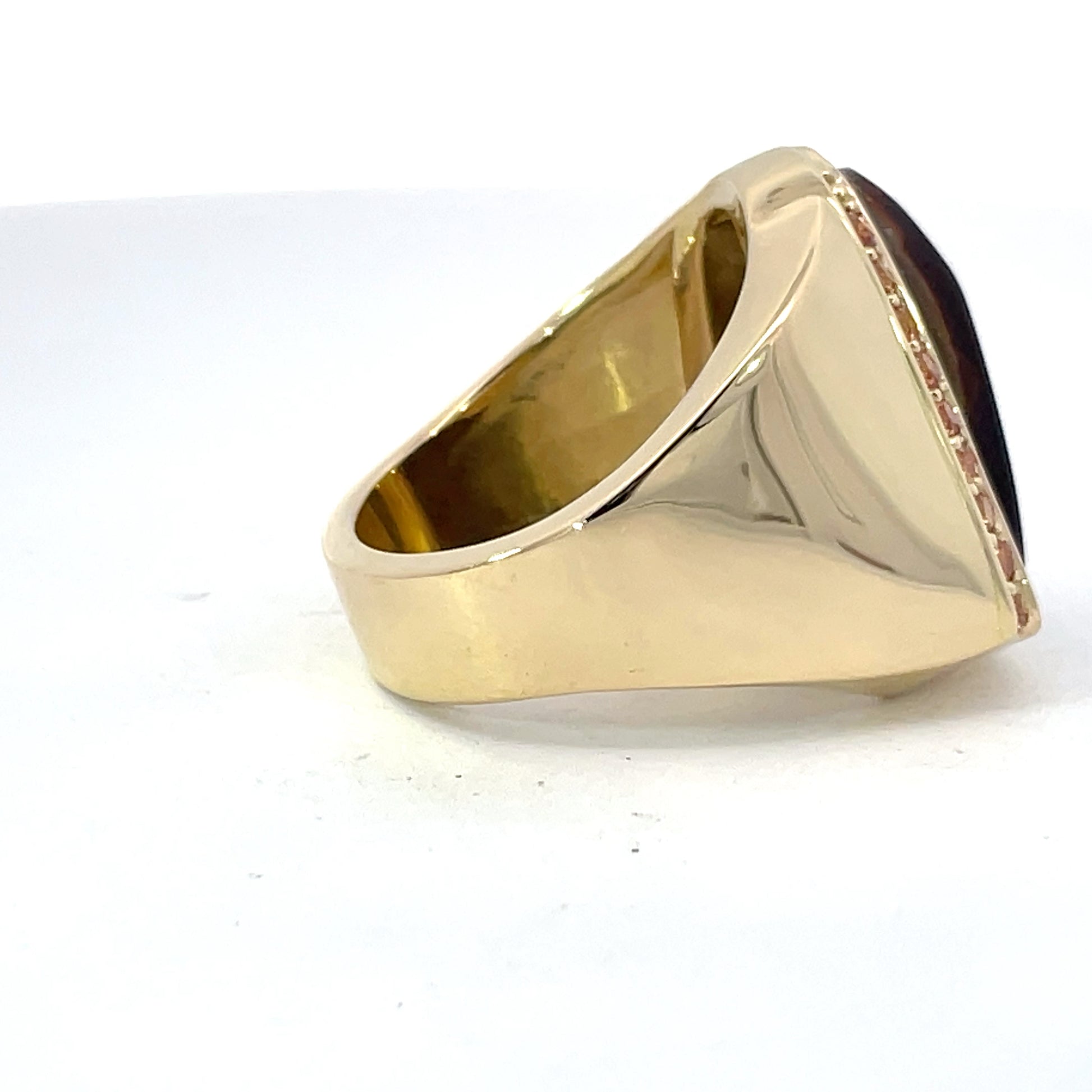 This exquisite gold ring features a stunning, uniquely shaped gemstone at its center, surrounded by a delicate array of smaller stones. The intricate design and warm hues make it a perfect statement piece for any occasion, adding a touch of elegance and sophistication to your ensemble.