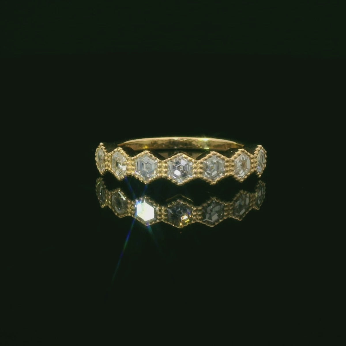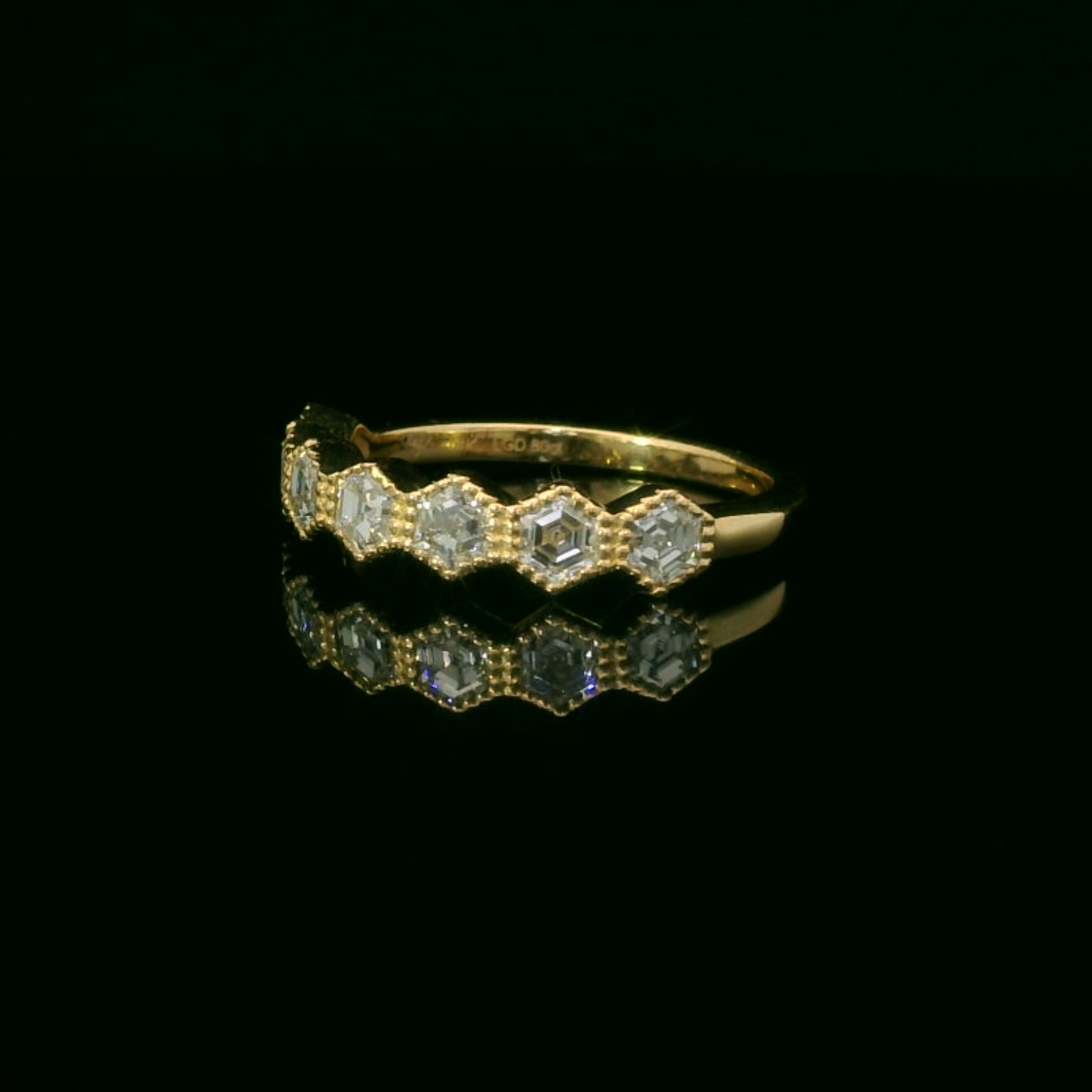 This stunning gold ring features a series of sparkling diamonds, each set in a delicate hexagonal design. The intricate detailing and brilliant shine make it a perfect accessory for any occasion, whether it's a formal event or a casual outing. Elevate your jewelry collection with this exquisite piece that embodies elegance and sophistication.