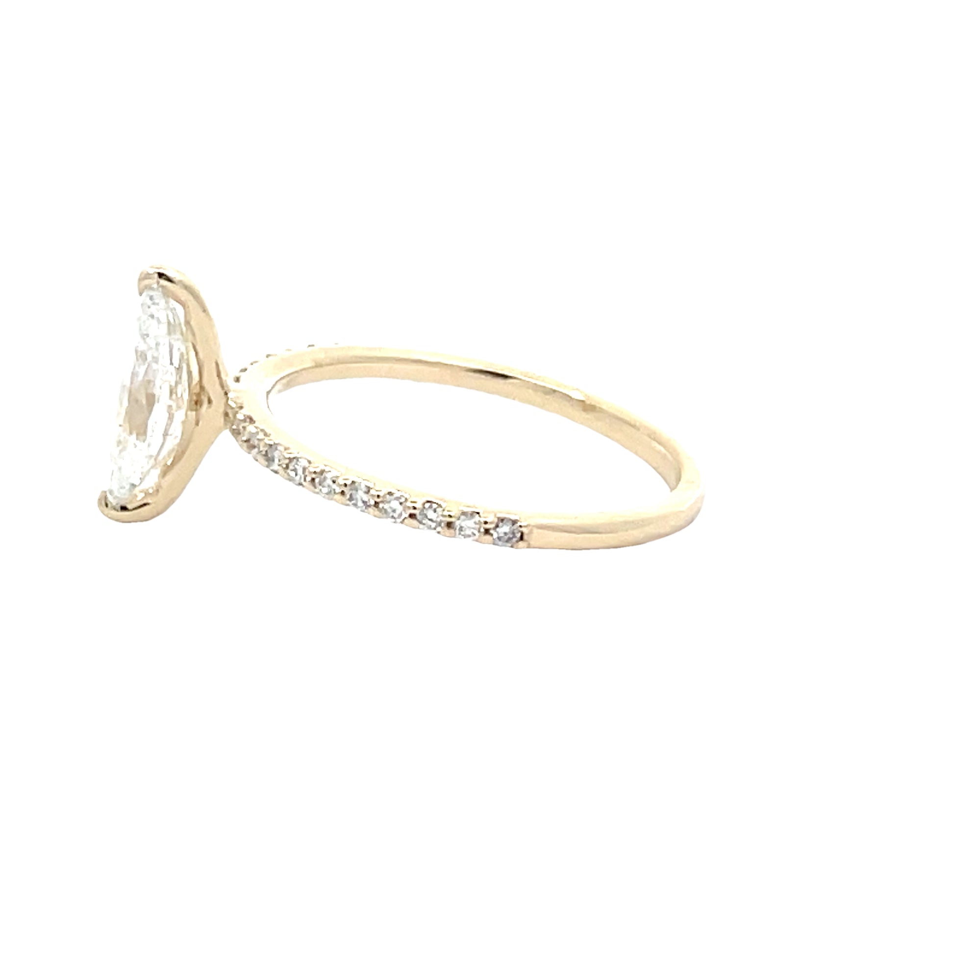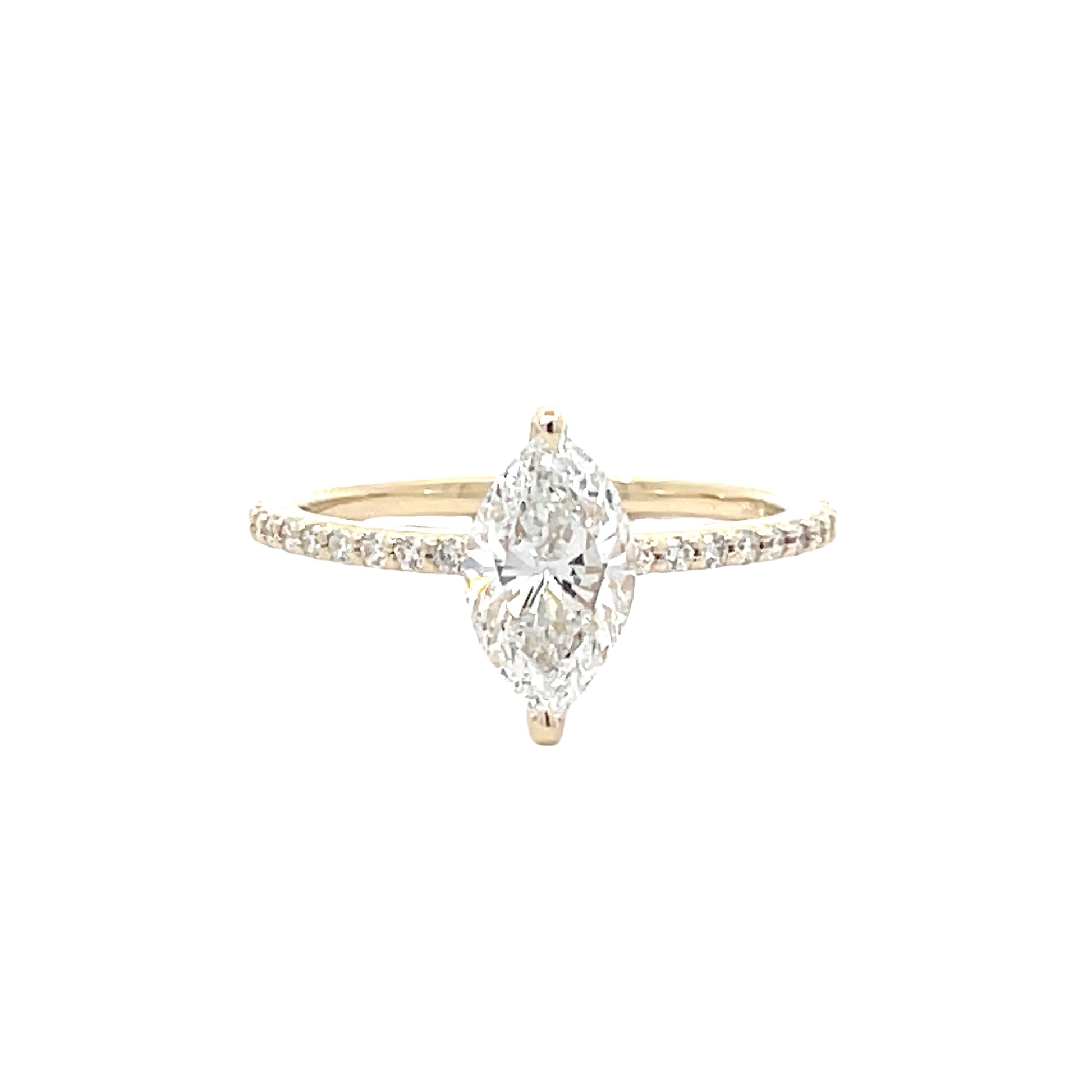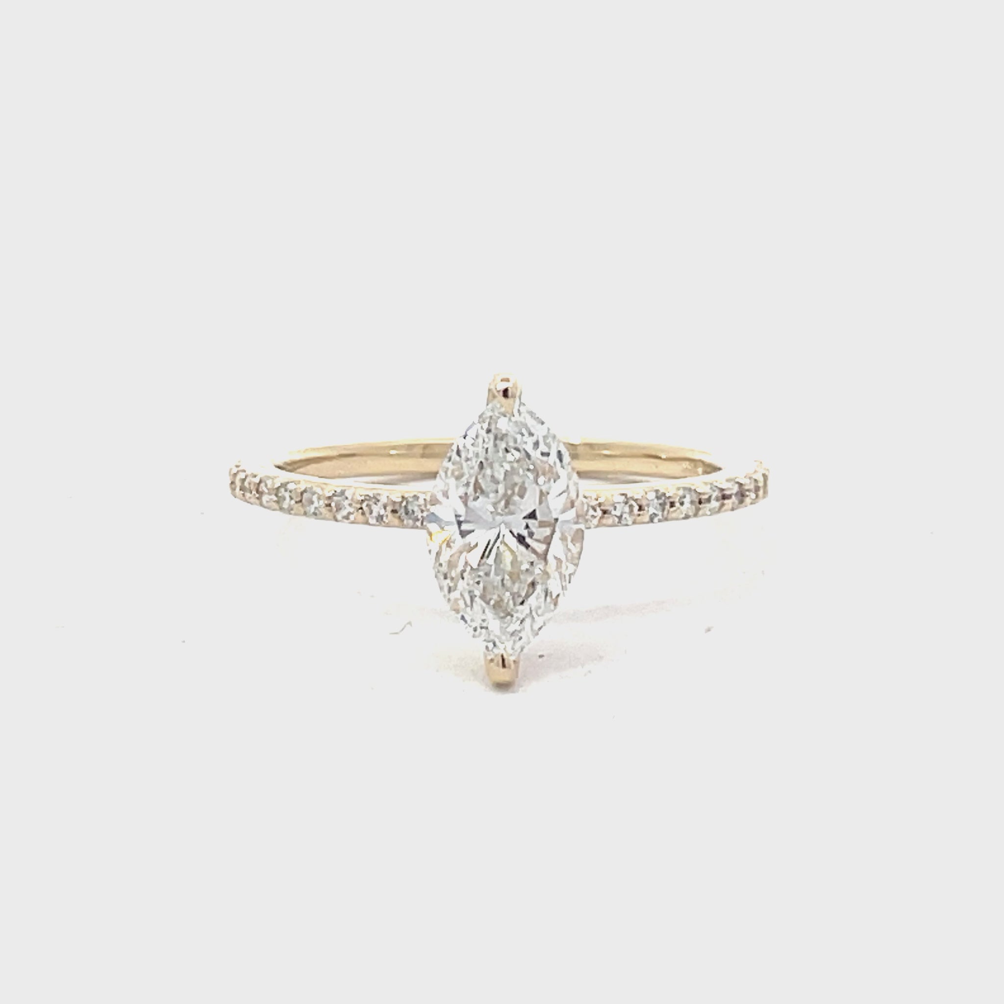 This stunning ring features a breathtaking marquise-cut diamond, elegantly set on a slim band adorned with sparkling smaller diamonds. Its timeless design exudes sophistication and grace, making it the perfect choice for engagements or special occasions.
