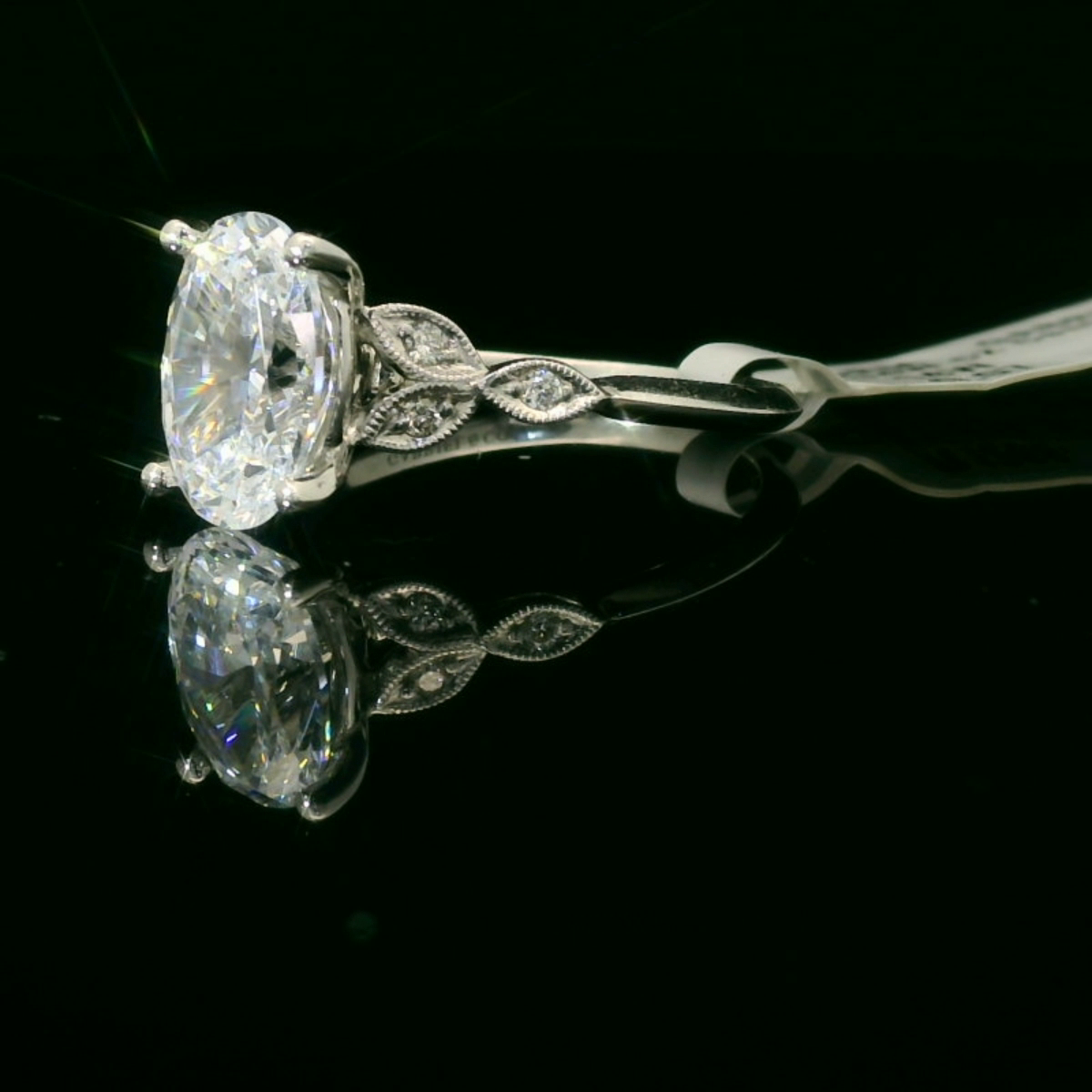 This stunning oval diamond ring features a brilliant centerpiece surrounded by delicate detailing, creating a timeless piece that captures the light beautifully. Perfect for engagements or special occasions, it symbolizes love and commitment with its exquisite craftsmanship.