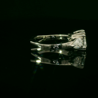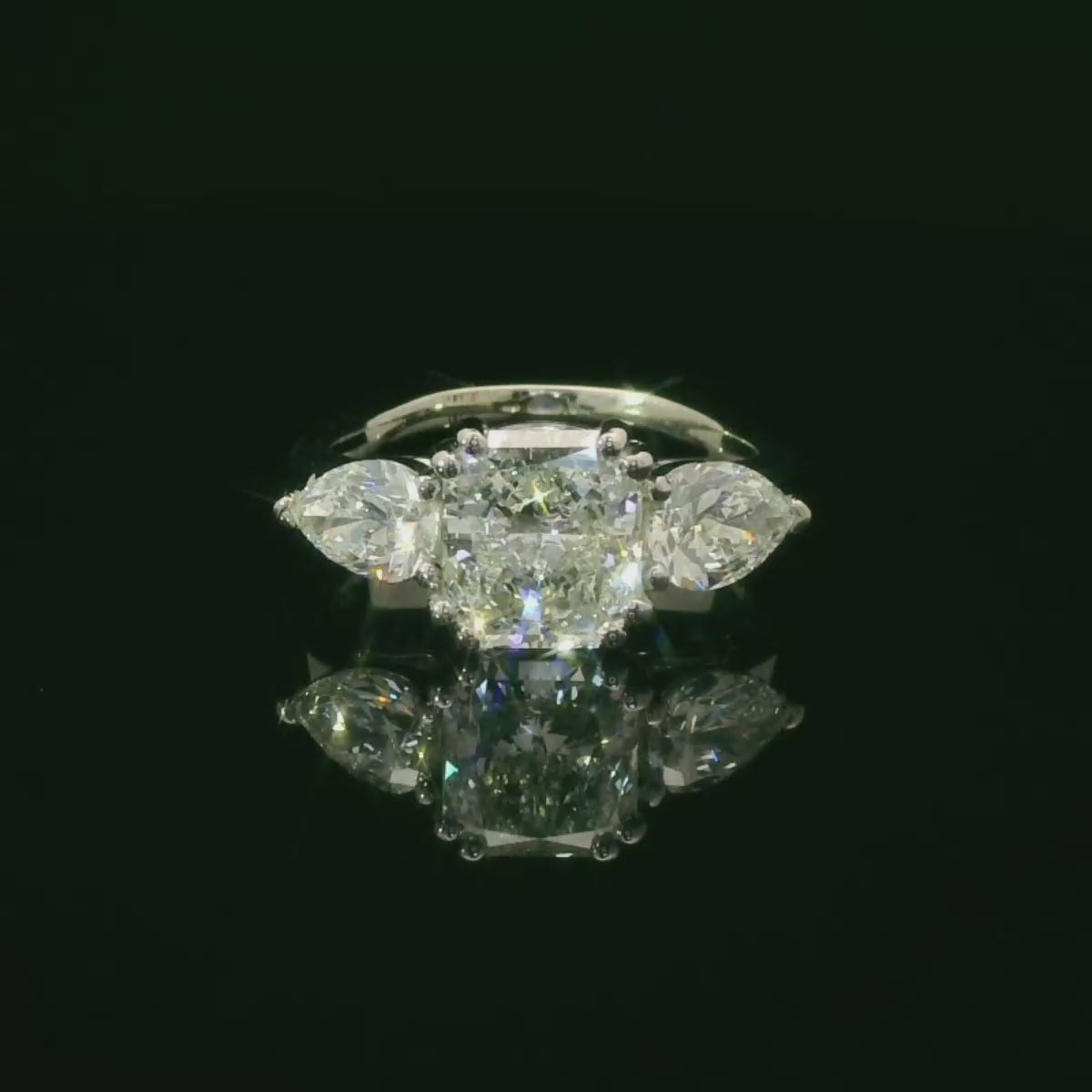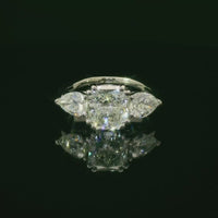 This stunning three-stone diamond ring features a captivating center stone flanked by two pear-shaped diamonds, creating a timeless and elegant look. The intricate setting enhances the brilliance of each diamond, making it a perfect choice for engagements or special occasions. Its classic design ensures it will be cherished for generations.