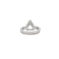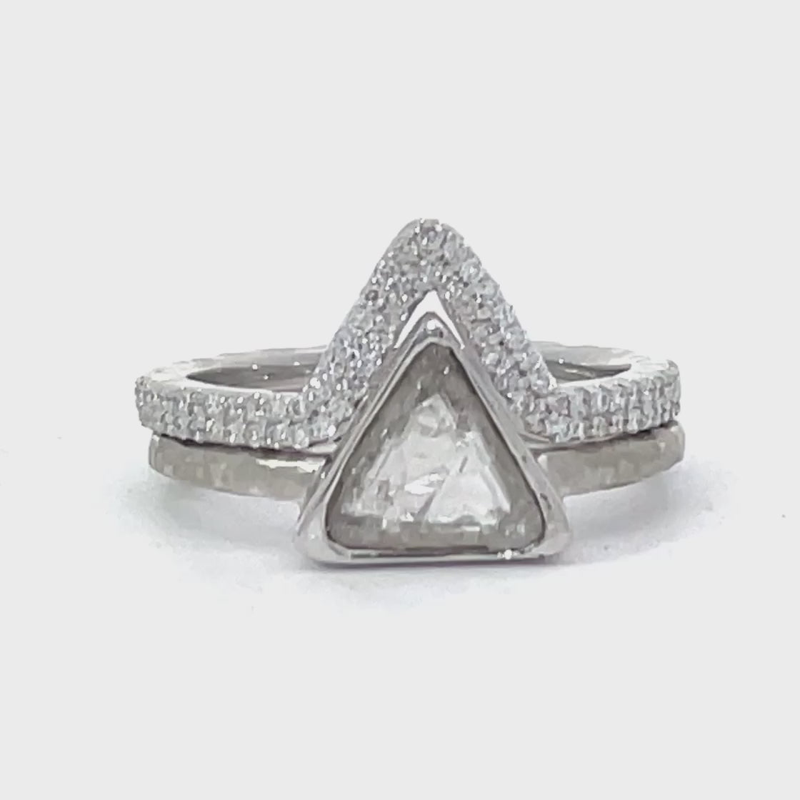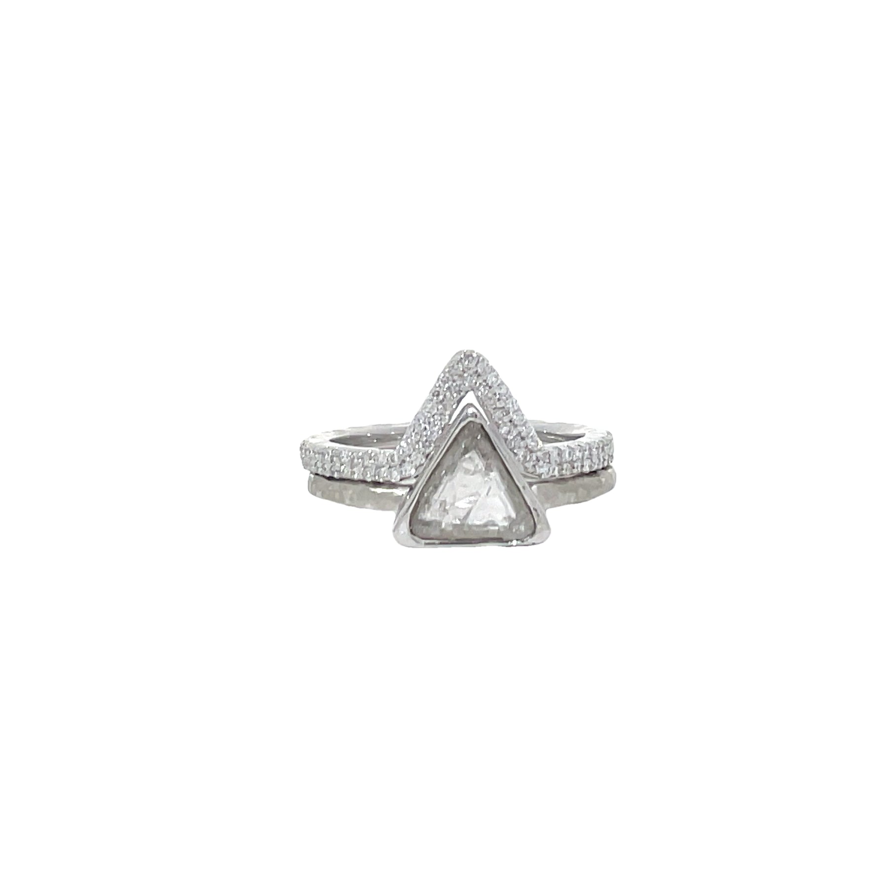 This exquisite ring features a unique triangle-shaped diamond, surrounded by a halo of smaller sparkling diamonds. The sleek band adds to its modern elegance, making it the perfect statement piece for any occasion.