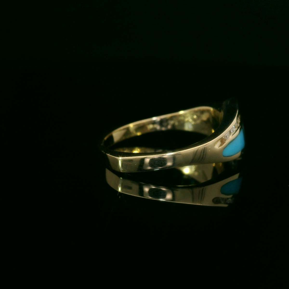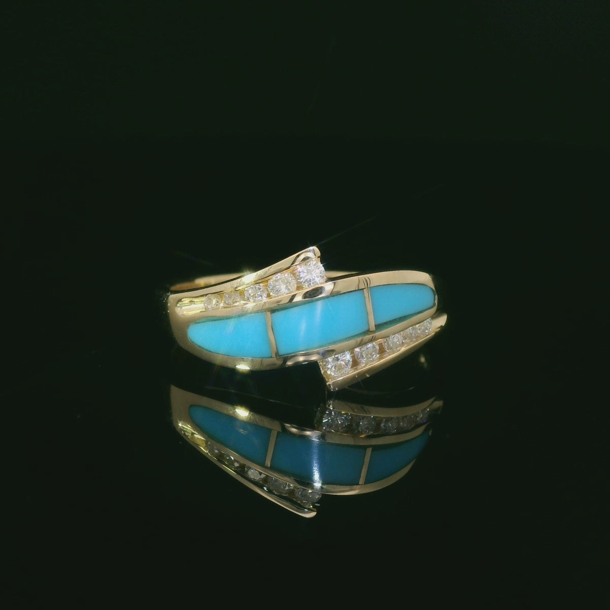 Discover the beauty of this stunning turquoise and diamond ring, designed to make a statement. The vibrant blue stones are elegantly set against a backdrop of shimmering gold, creating a captivating contrast that draws the eye. Perfect for any occasion, this ring adds a touch of sophistication to your jewelry collection.