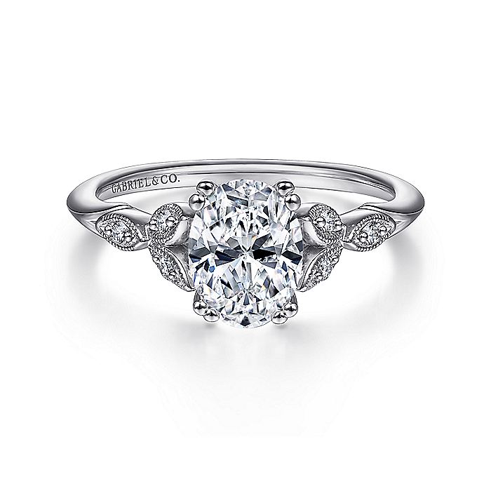 If she's dreaming of a €˜fairytale' wedding, she'll love this oval engagement ring with Victorian style detailing. A trio of delicate diamond and milgrain petals on either shoulder embrace the center stone and add 0.07cts of sparkle. Finished with a sculpted shank of polished 14K white gold, this setting radiates romance.