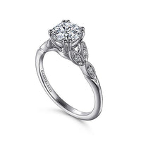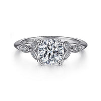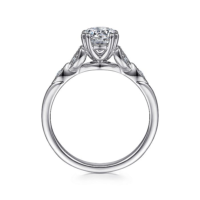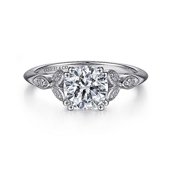 If she's dreaming of a €˜fairytale' wedding, she'll love this round engagement ring with Victorian style detailing. A trio of delicate diamond and milgrain petals on either shoulder embrace the center stone and add 0.07cts of sparkle. Finished with a sculpted shank of polished 14K white gold, this setting radiates romance.