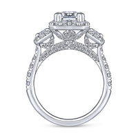 Play up the elegant appeal of your emerald cut center stone with this 14K white gold 3 stone halo engagement ring. The center stone and side stones are each nestled within glittering pavé diamond halos. Accent diamonds continue along the upper shank and lend surprise sparkle to the gallery of this 1.70ct diamond setting.