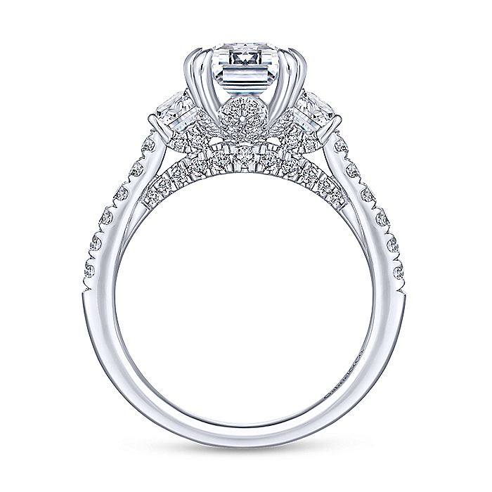 Emphasize the clean lines and timeless allure of your emerald cut center stone with this classic 3 stone setting. In addition to the substantial side stones, the upper shank, gallery, and basket are garnished with smaller accent stones for unforgettable radiance. Thrill your bride-to-be with this 14K white gold and 0.93ct diamond engagement ring setting.