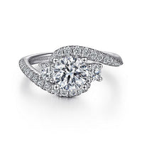 Flanking your elegant round center stone, two radiant round side stones give this modern setting a meaningful three stone silhouette. The two sides of the bypass style band curve in opposite directions before wrapping around the center stone, cradling it in a delicate embrace. This 14K white gold and 0.56ct diamond setting is a stunning token of your love.