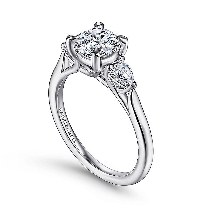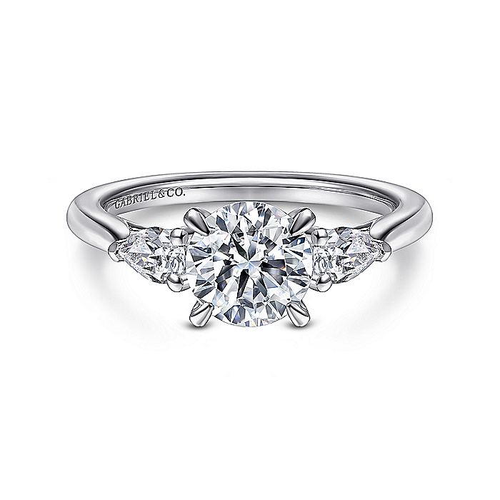 Romantic 3 stone engagement ring settings represent the past, present and future of your love. Two pear shaped side stones grace this style, stationed on either side of a round center stone. Crafted from 14K white gold, this ring also features a polished shank and trellis settings.