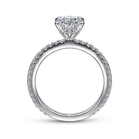 Allow your chosen 1ct oval center stone to truly shine with this understated 0.42ct diamond setting. Pavé set accent diamonds outline almost the entire 14K white gold shank which has a classic slim and straight silhouette. Surprise diamonds on the basket put the finishing touch on this skillfully crafted engagement ring.