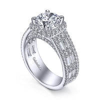 A cushion cut halo brings a soft, romantic look to this 14k white gold engagement ring setting. Four rows of round and baguette diamonds blanket the wide band while dainty accent stones ornament the curving diamond gallery beneath the crown.