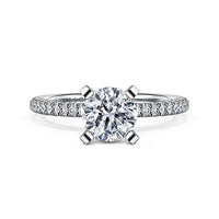 This refined round cut engagement ring has an iconic silhouette that serves as an unmistakable symbol of betrothal. Four 14K white gold prongs secure your 1ct center stone. The slim straight shank features 0.12cts of pavé diamonds, encrusting the upper half in glorious glitter.
