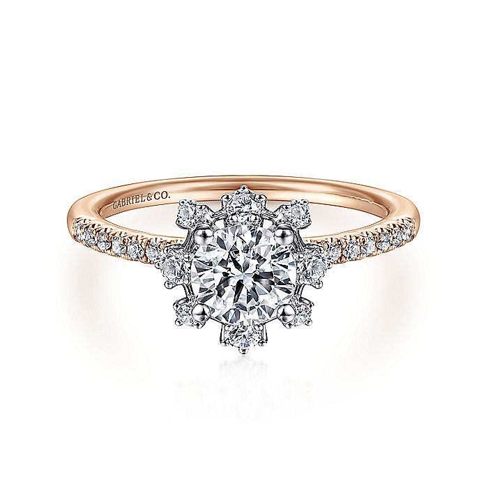A one-of-a-kind starburst halo set in classic 14K white gold adorns this delicate engagement ring designed for a round cut center stone. This celestial beauty is set atop a straight shank of 14K rose gold, creating mixed metal magic. Including the accent diamonds along the upper shank, this setting features 0.30cts.