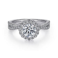 Ribbons of scintillating pavé diamonds set in 14K white gold are loosely interwoven, creating the romantic band of this twisted engagement ring. Additional diamonds are found in the classic round halo as well as tucked away in the gallery beneath the 1ct center stone. This milgrain-accented ring features 0.5cts of diamonds in all.