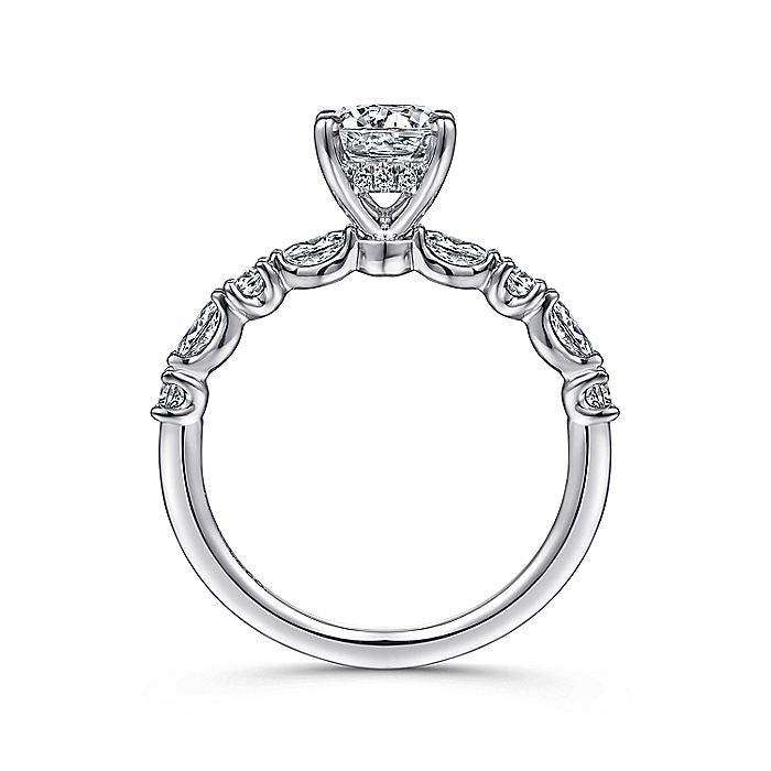 Punctuated by alternating round and marquise cut diamonds, the straight shank of this contemporary 14K white gold engagement ring offers captivating sparkle. Together the accent diamonds lend 0.46cts to enhance your 1ct round cut center stone, which is secured by four prongs.