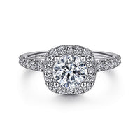 Find the cushion halo engagement ring of your dreams at Gabriel & Co. This 14k white gold pave setting of diamonds is selected under rigorous standards.