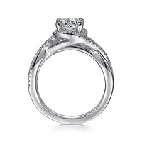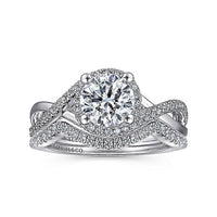 In this 14K white gold engagement ring, a diamond encrusted criss cross band leads into bedazzling diamond halo center stone.