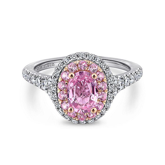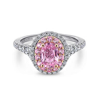 An oval cut pink sapphire is the feminine focal point of this truly original engagement ring with both diamond and pink sapphire halos.