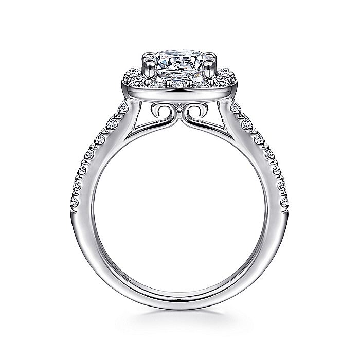 Brighten your beloved round cut center stone with this contemporary cushion shaped halo engagement ring. A bevy of pavé set diamonds adorn the halo and the upper shank creating 0.63cts of sparkle. Crafted from 14K white gold, this setting is a stylish and sophisticated token of your love.