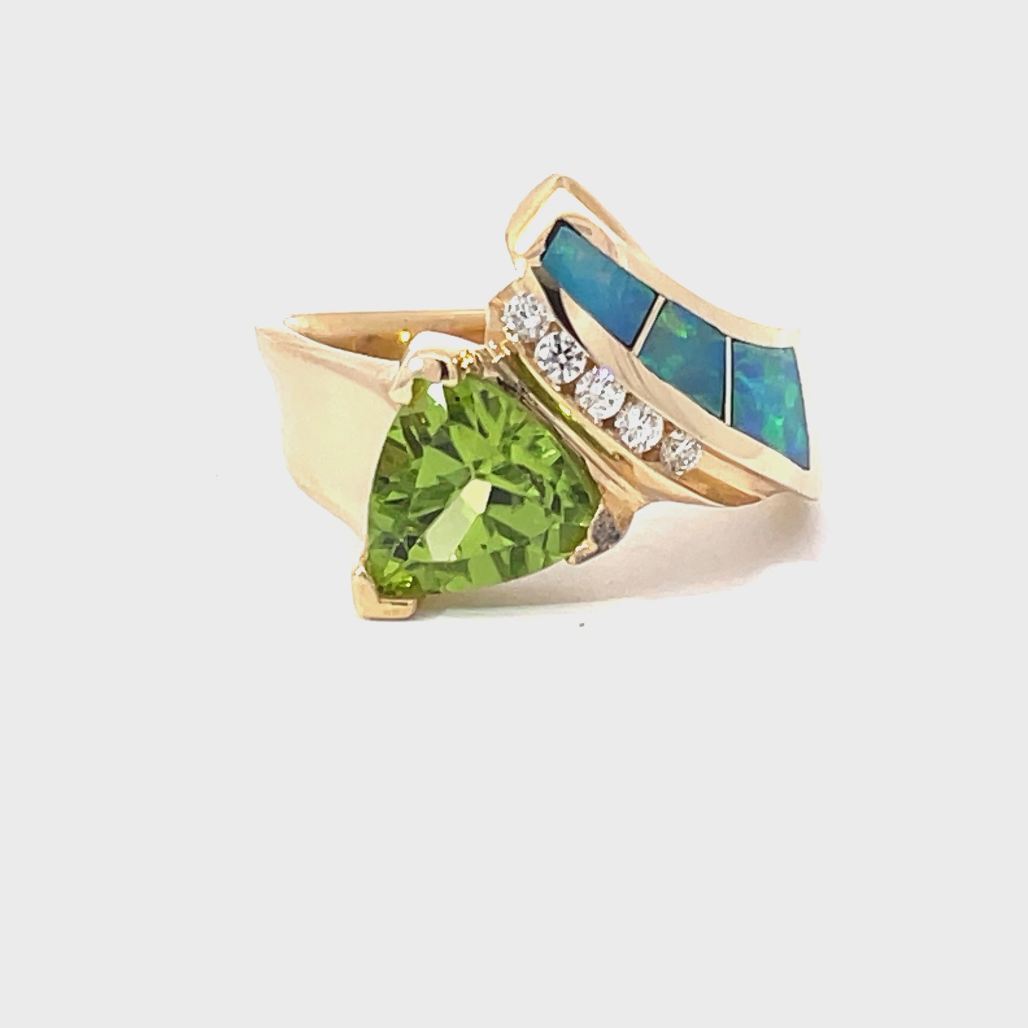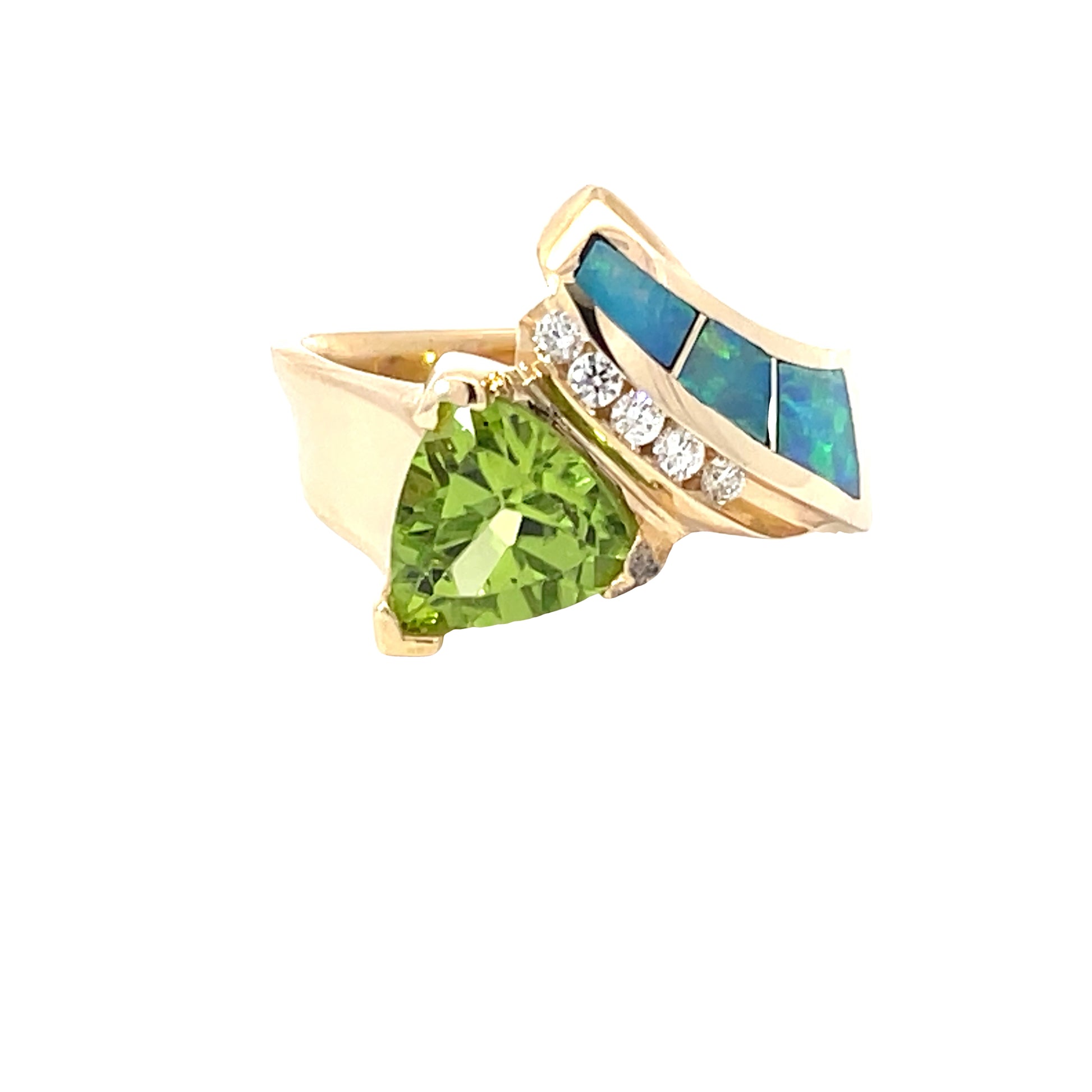 This exquisite gold ring showcases an elegant fusion of vibrant gemstones. A stunning green triangular gem takes center stage, flanked by a striking array of blue opal inlays and shimmering diamonds. Perfect for adding a touch of luxury to any outfit.