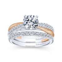 Elegantly intertwining white and rose gold, this Gabriel & Co. 14k Two Tone Gold Contemporary Twisted Engagement Ring exudes timeless sophistication. With a total carat weight of 0.18, this exquisite setting awaits the perfect center stone to complete its allure.